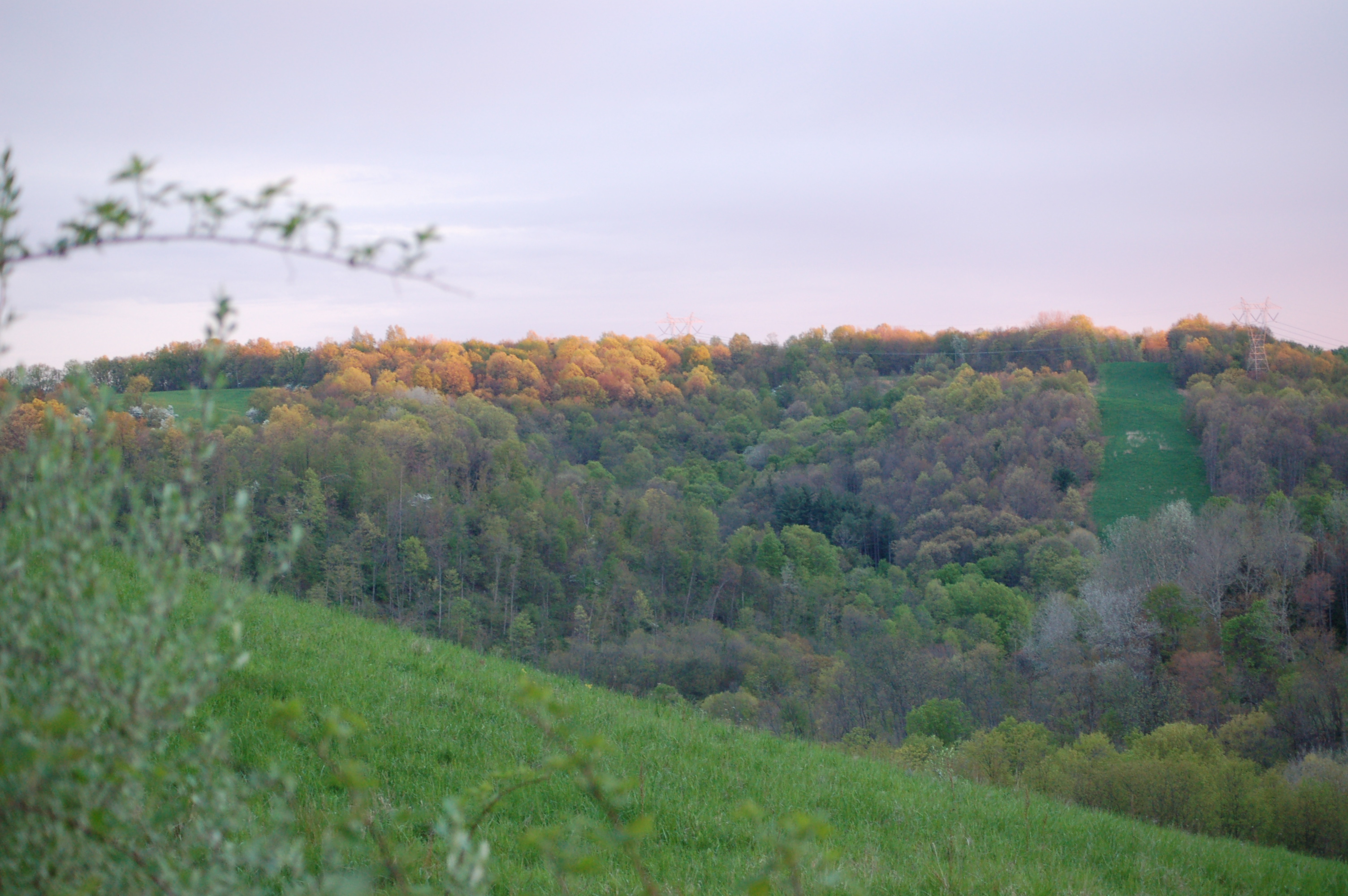 I walked up hill and found a pile of hen feathers. A neighbors plane began to circle and circle and circle. He must be getting hours on his plane because he circled for over 1 1/2 hours! The runway is on the next hill. A crew was working along the road at a gas line. They, too were making noise. As I approached the wood lot where a gobbler often hangs out I could hear my farmer friend working his tractor in the fields. I imagined all these people getting together planning these events to hinder my hunting progress. (Just kiddin’) I sat down, called periodically and actually fell asleep for a time.