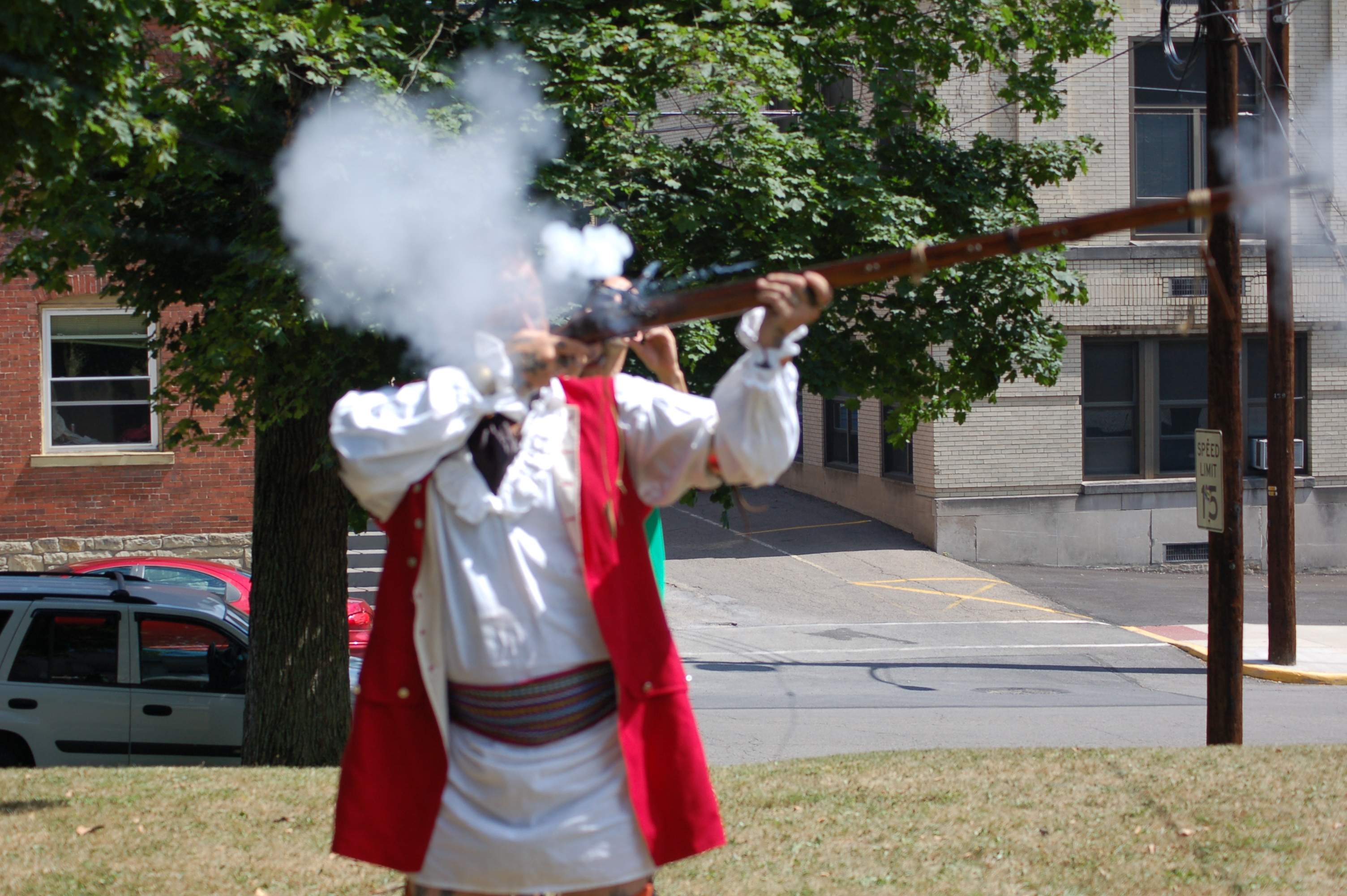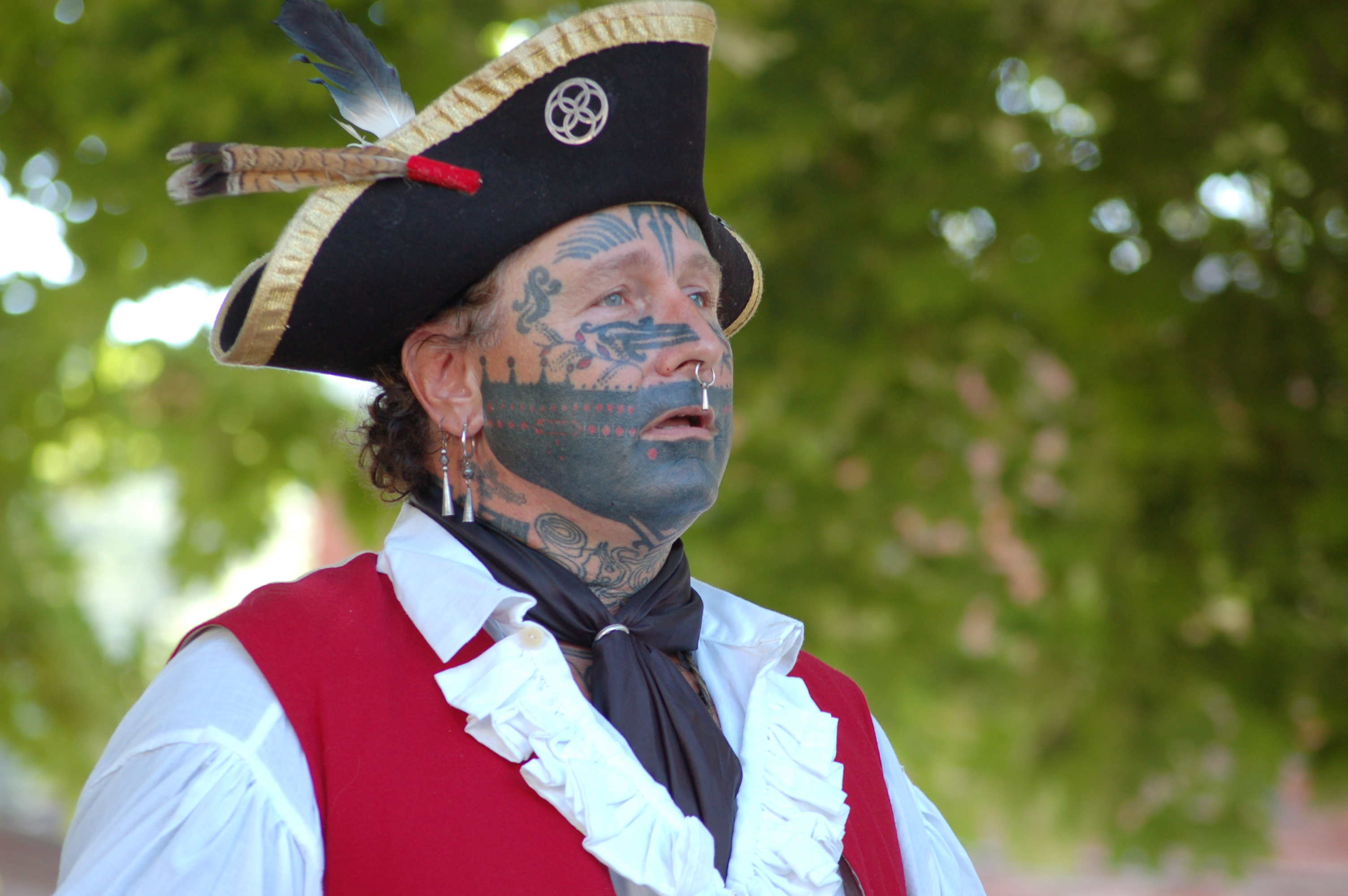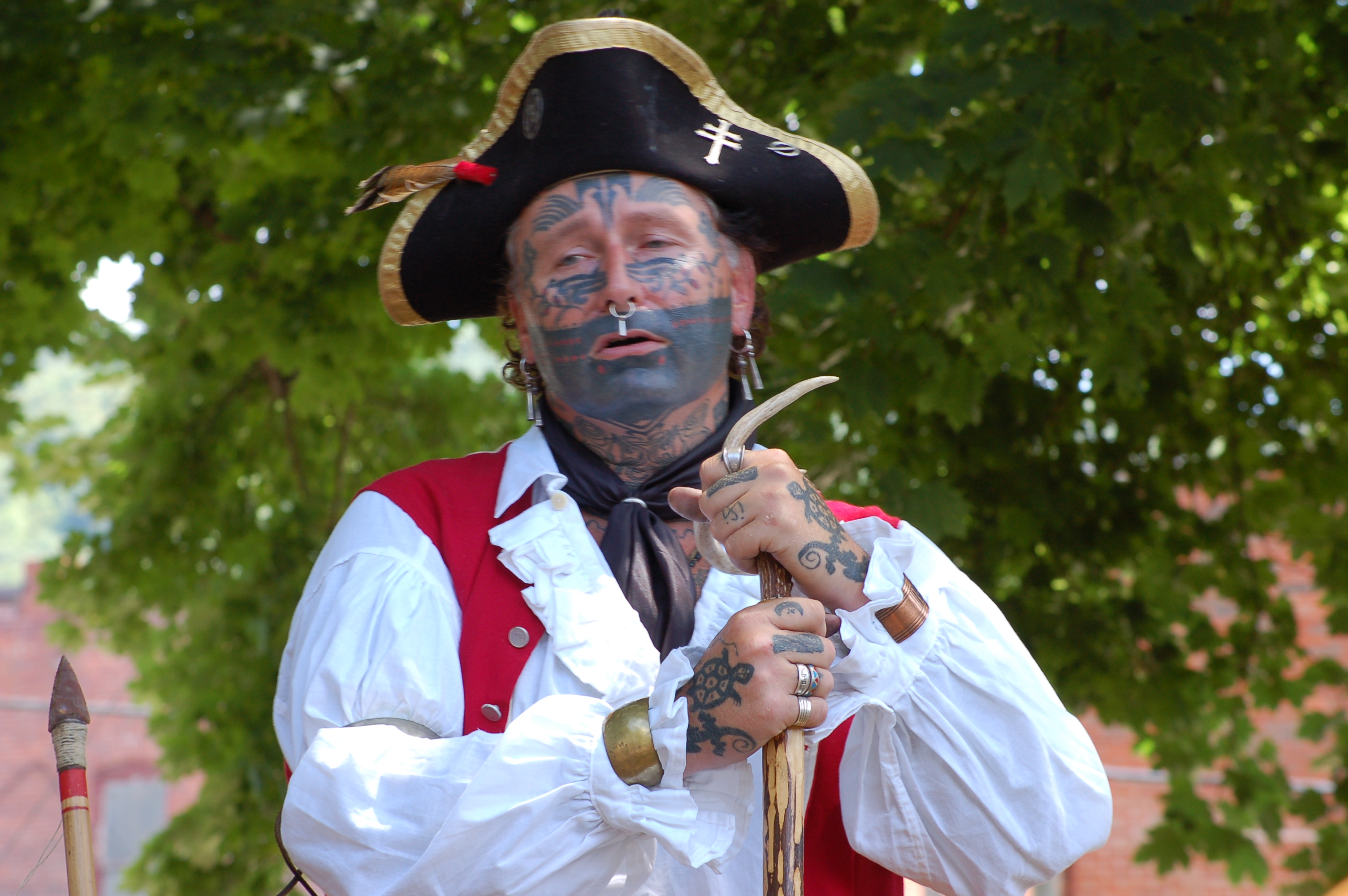 Smoke-In-The-Sky, (a.k.a. Jon Miller) of Hopwood, Pennsylvania spent hours at the Armstrong County Historical Museum in Kittanning on July 16. The heavily tattooed Jon, was dressed in period correct clothing often found in the 18th century on native-Americans. The Indians of that time commonly would be observed wearing clothing of the “white man” after all their influence and trade had been around for many years by the time of 1756.