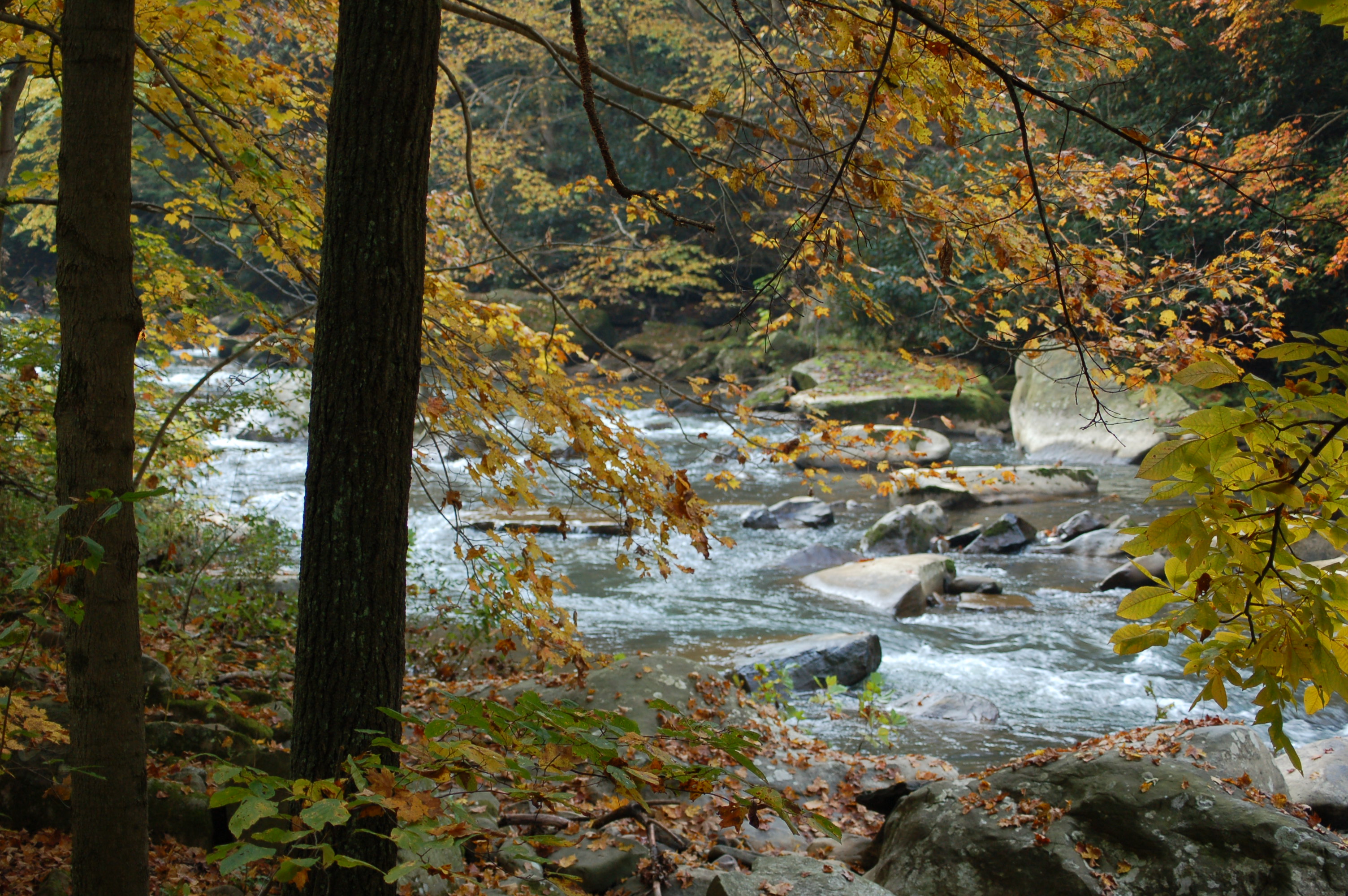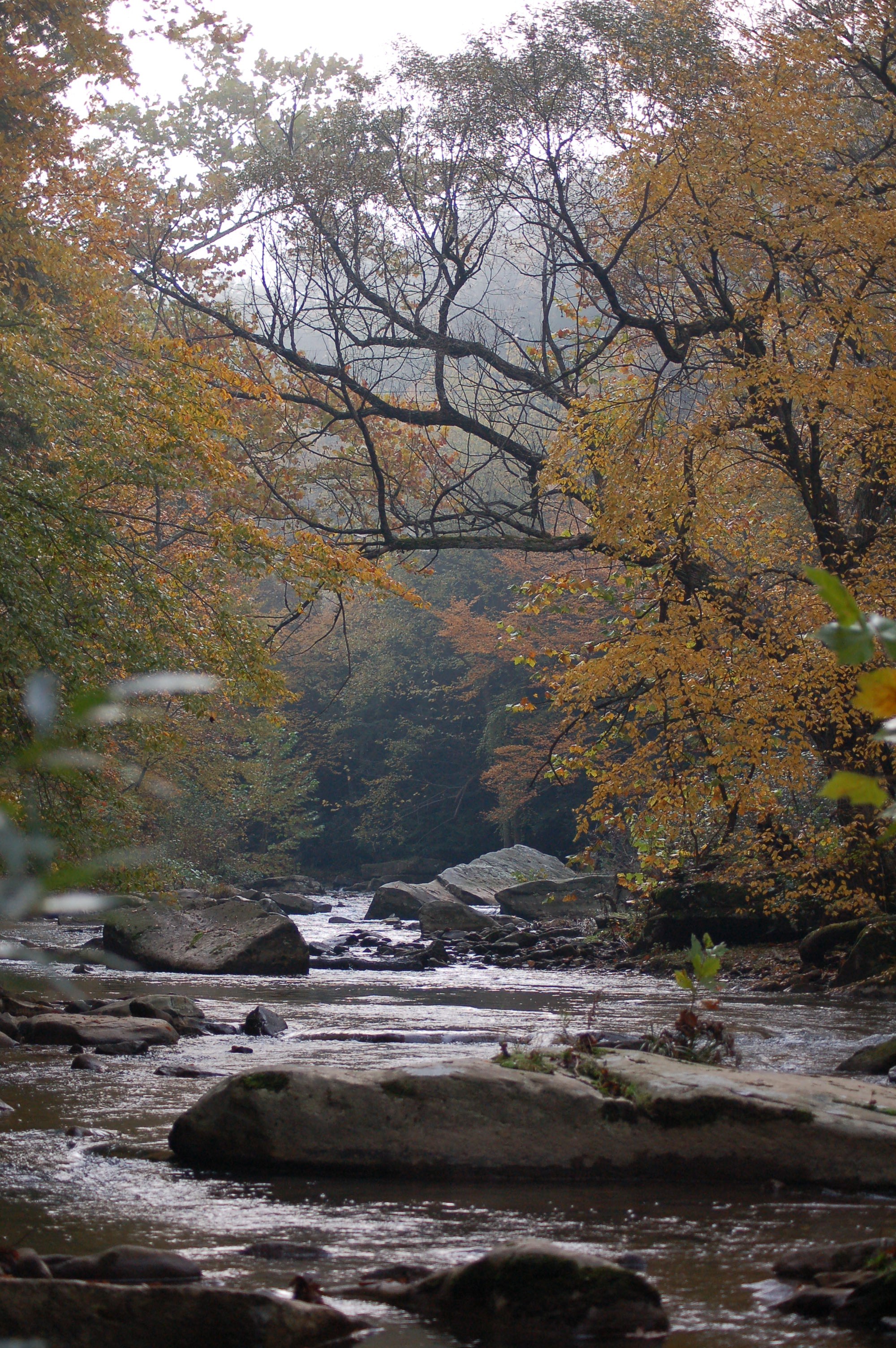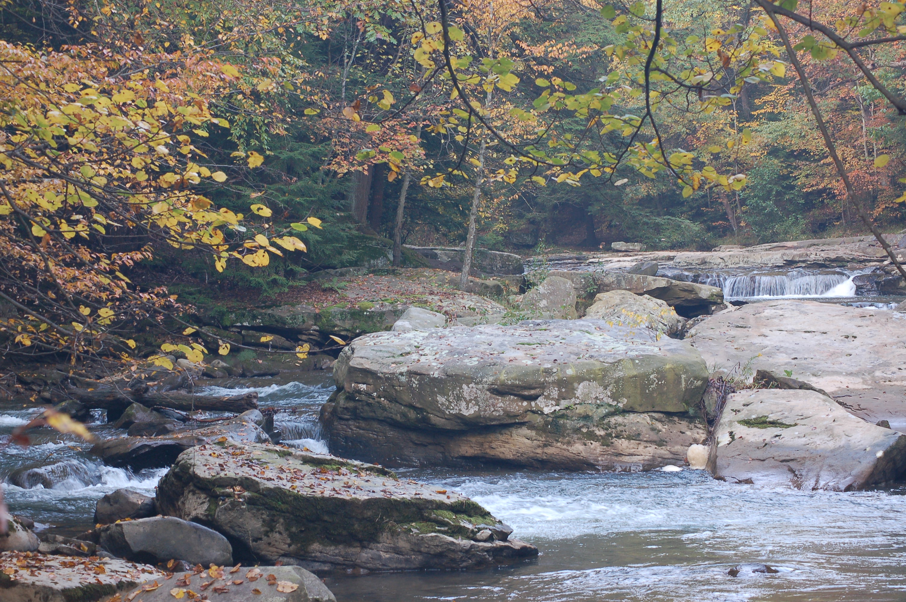 I chose to walk along the creek’s banks as much as possible. The terrain will not easily permit walking at several points. The surrounding slopes are rather steep and choked with rhododendron and hemlock. this makes for difficult travel, however, these conditions allow for the dark green colors to greatly contrast with the waters and autumn foliage.