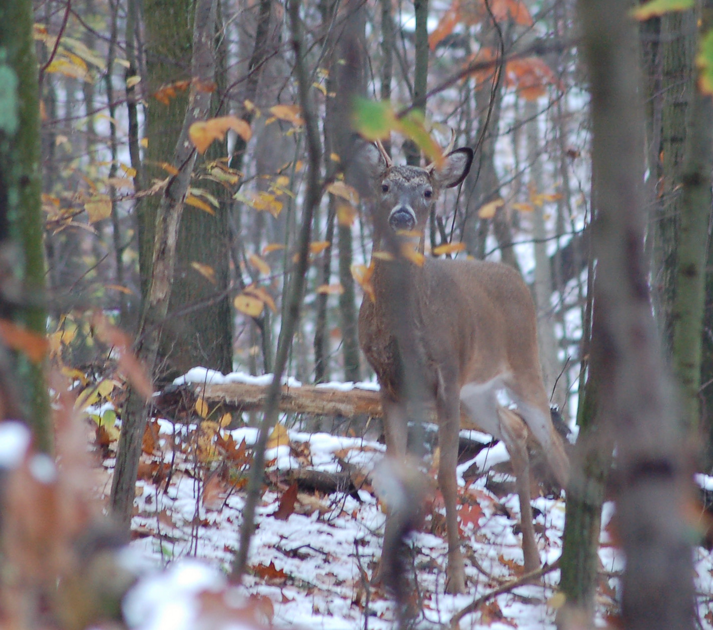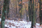 I was hoping to get my step-father, Bob in place for a fall turkey this day. One obstacle we encountered early was the left over snow from Saturday. The remaining snow patches were iced and very crunchy. We tried to stay in the areas melted off when possible. I stopped higher on the hill to listen because of the noise. Within a short time I heard something walking when a buck walked by at about 18 yards. I believe it was a 6-point.
