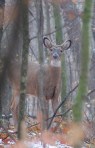 Later we began searching for other turks when I saw one sneaking out ahead. I circled and saw more. I tried for a break and one bird broke away. Later I called this bird in but Bob’s movement while trying to manuever the shotgun spooked the turkey. We remained for a while when a buck was observed coming through the trees. This buck came within 10 yards of us. He was a legal eight point. I didn’t have my camera out of the case due to falling snow from the limbs. The buck when upon us yielded some sad information. He was blind in his left eye. I went for the camera and managed a few shots but the best opportunities had been lost!