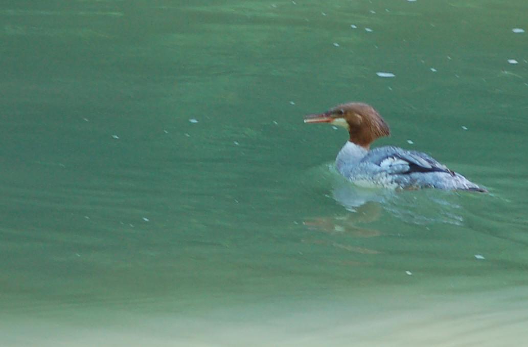 The moment I became visible the two adults and their three half-grown goslings became nervous and the eased down stream away from my presence. Strangely, a fourth bird with them was a female common merganser. She went air-borne! I would see her several times as the morning progressed.