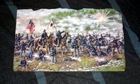 The Civil War painting entitled, “THE WHEATFIELD-WHIRLPOOL OF DEATH” has ventured into a new method of display. STONE! The process places a copy of the print onto flat, but irregular, stones. The contrast of the stone’s texture makes for an interesting touch of character to the image. If anyone would be interested these are available for purchase. The original painting detailed the battle at Gettysburg featuring the 62nd Pennsylvania Volunteer Infantry. The site became known as the battle at the Wheatfield.