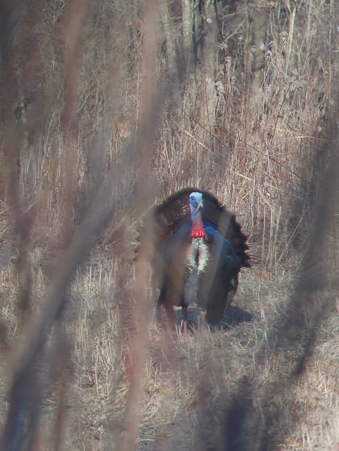 Another gobbler began gobbling from the top where I had just walked from. The first gobbler had become quiet and within a minute I could see the “snowball white” head followed by glossy black body outside of the woods. He came towards me fast and I was blessed to get about eight photos. He heard the first click of the shutter and quickly began to show concern. Most of the photos were decent shots. The grasses and briars between the tom and myself did cause some haziness, but the conditions can’t always be controlled in such settings.