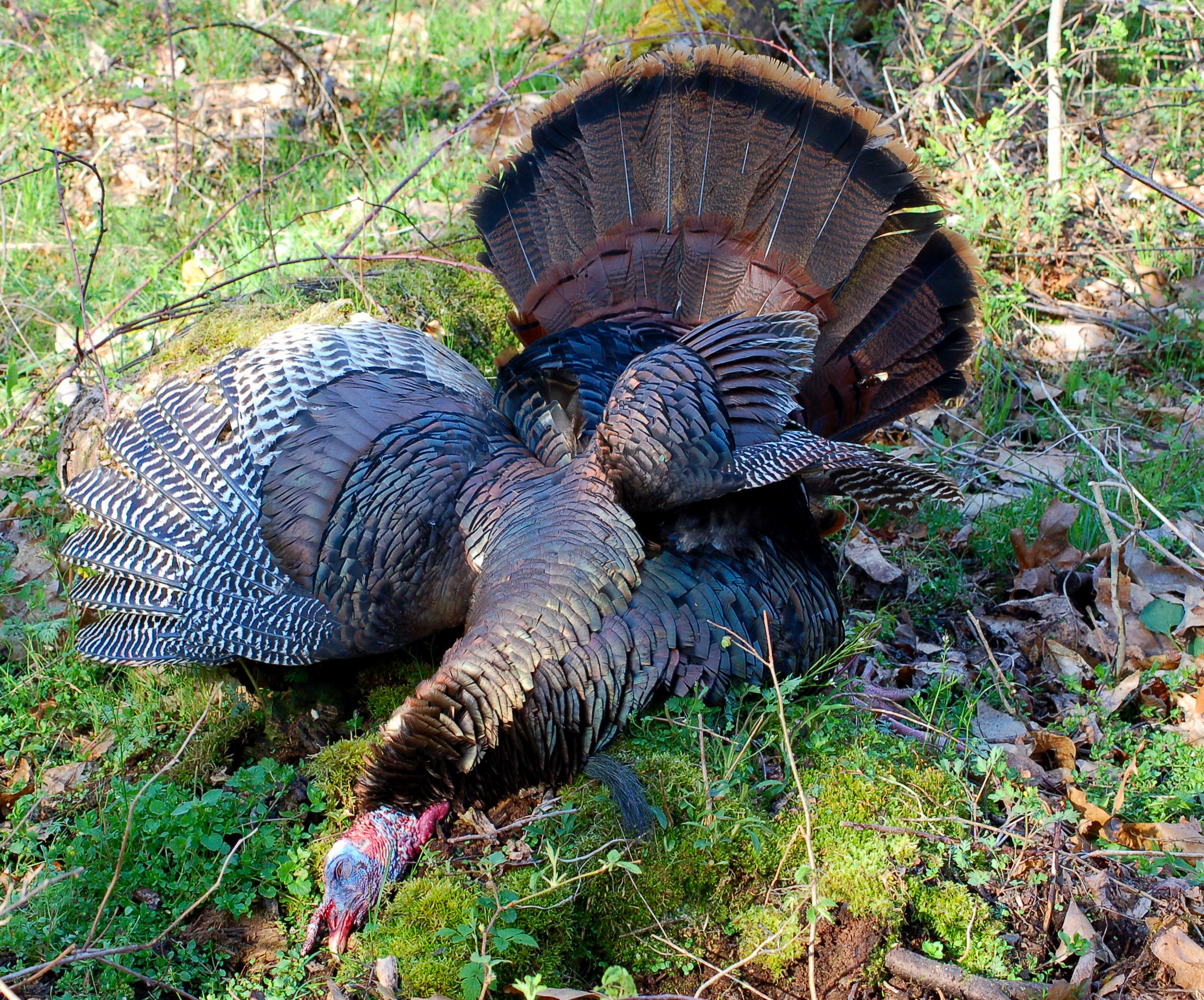 I saw plenty of deer and squirrels as I continued sneaking and calling when I heard it… a gobble from above me. I moved in and set up and gave a series of calls and waited. The big gobbler crept close gobbling and strutting. I could hear his drumming sounds as the gap narrowed.
