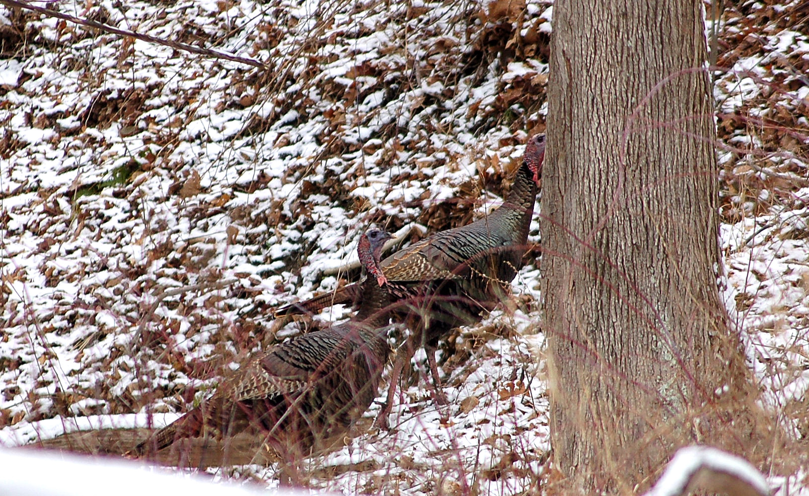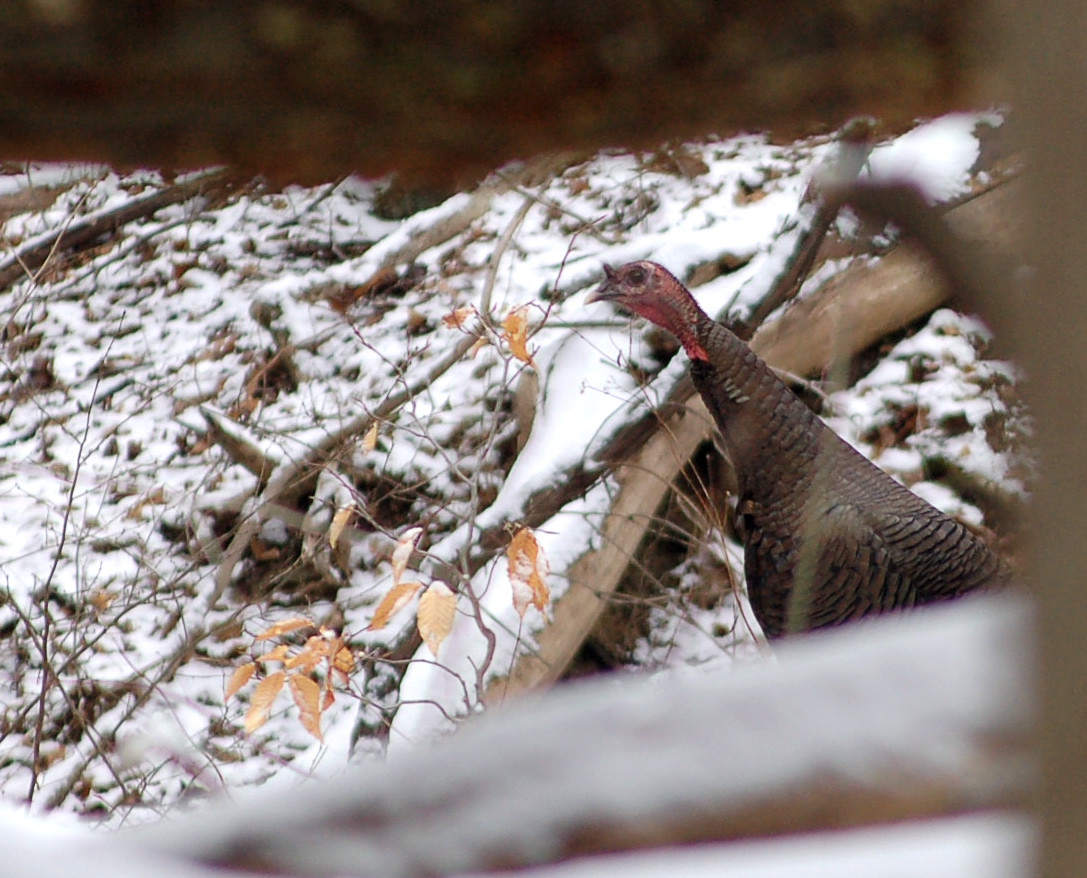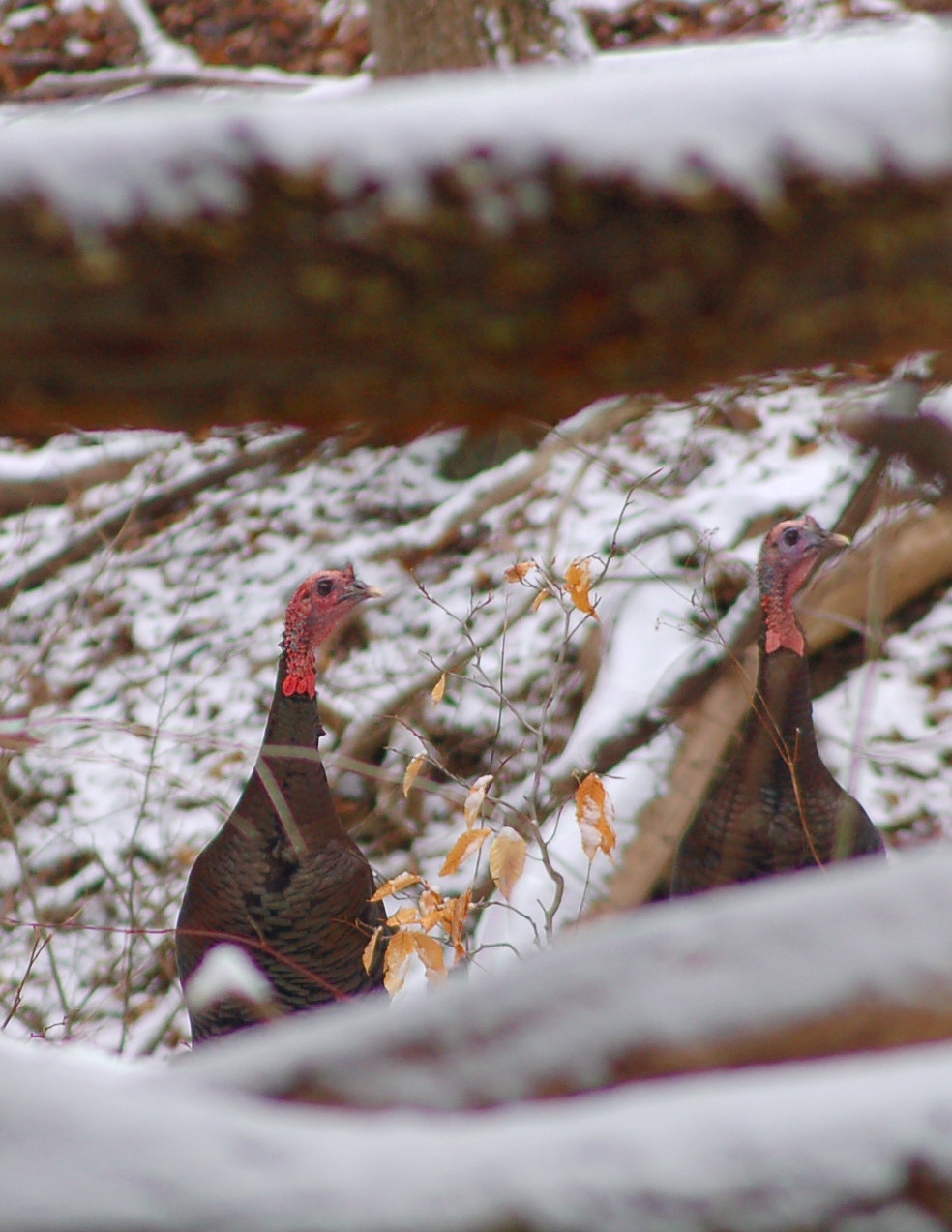 I called and gobbled a few times. The birds stopped their feeding. My silence eventually moved the gobblers towards me. Two jumped up on a log, but I couldn’t get my camera on them. I waited. A few minutes more I had six, or seven, gobblers all around. I managed to take over twenty photos before they figured me out and went airborne.