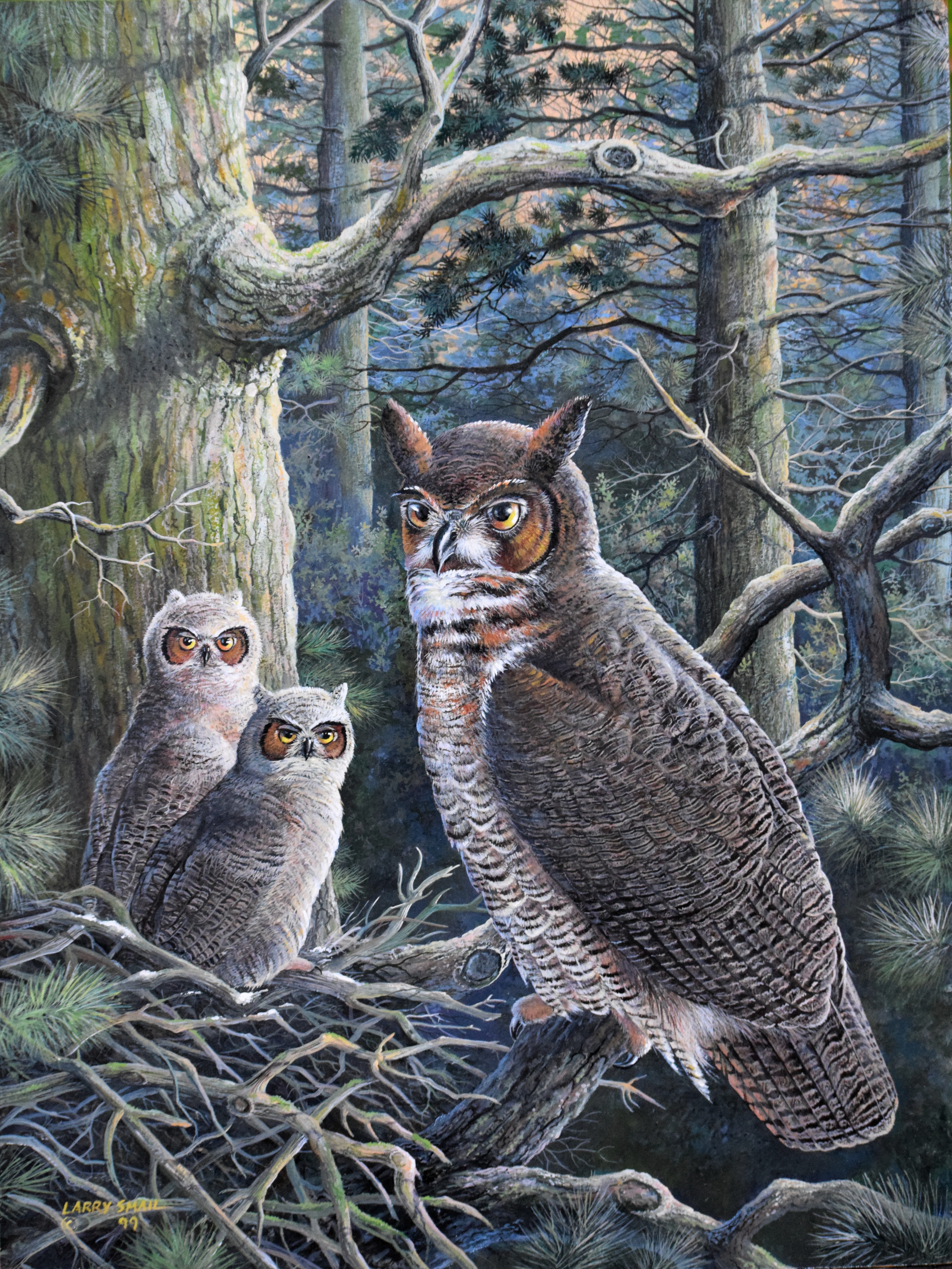 The Great-Horned Owls is an 18 by 24 inch acrylic on Masonite. I completed this art in 1999. I think I was four years old at the time. This art is called