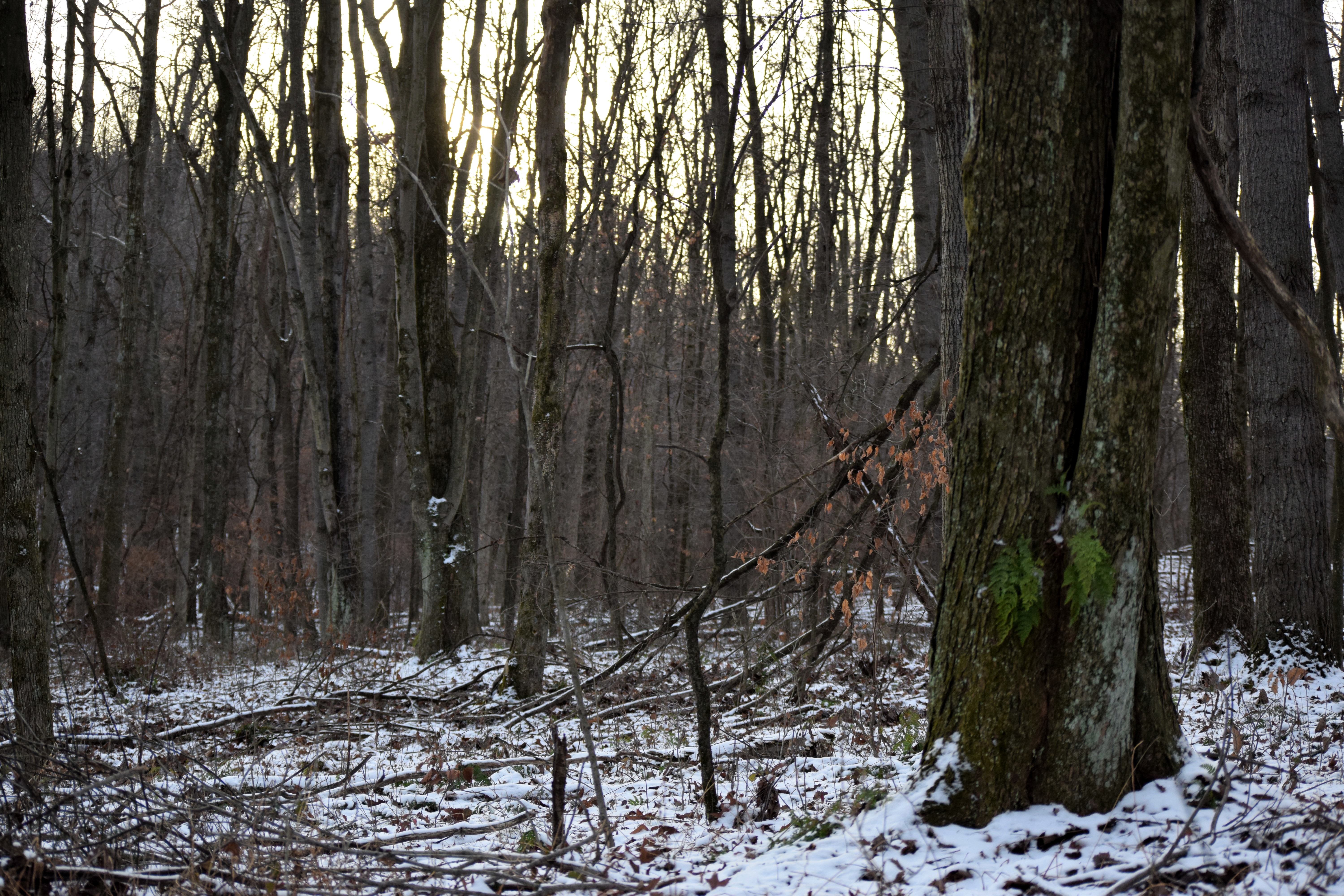I was sneaking around the best I could under the frosty conditions on the forest floor when I saw a bedded deer about eighty yards away. I soon noticed a second deer bedded along with a meandering doe. (A fourth deer would later be viewed.) This moving doe spotted me standing. She failed to identify me and was curious and walked towards me a short distance. Limbs kept me from shooting, but I hoped for an open shot.