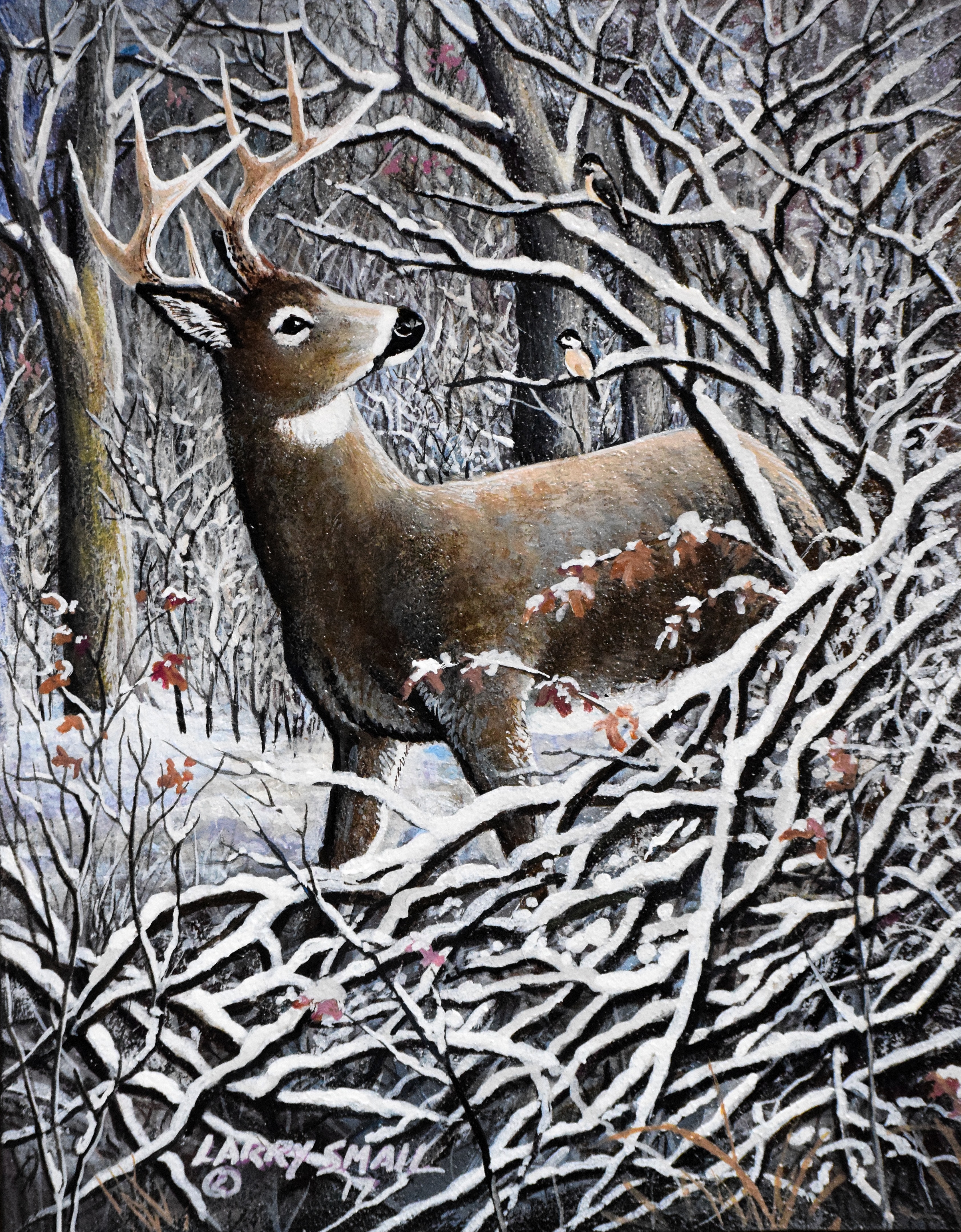 I had a small piece of gesso-treated Masonite and decided to utilize into a painting. I had just taken a hike on a day with a few inches of snow on the ground and became inspired. the subject was to be a buck White-tailed Deer.