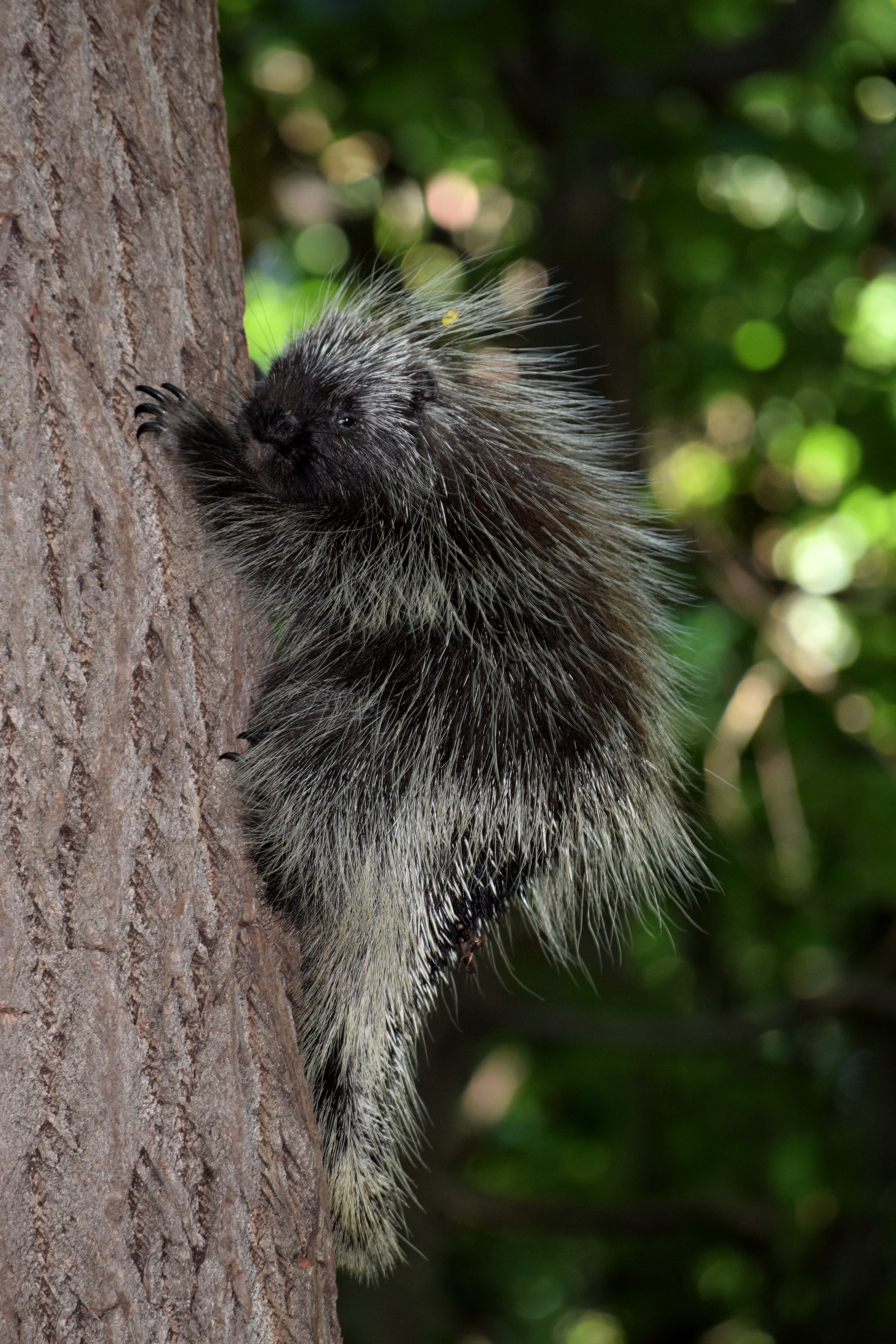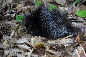 The first Porcupine I walked on was a small little feller. I would have liked to have held and petted this critter, but my smarts told me otherwise. I was within a couple of feet of this little guy and he instinctively would turn his backside towards me. This is a defensive posture. I walked on through the woods and heard and saw another young Porcupine. This one was slightly larger than the earlier one. This Porky, also, had more white coloring on the body. This one didn’t stay put and began climbing a tree for safety!