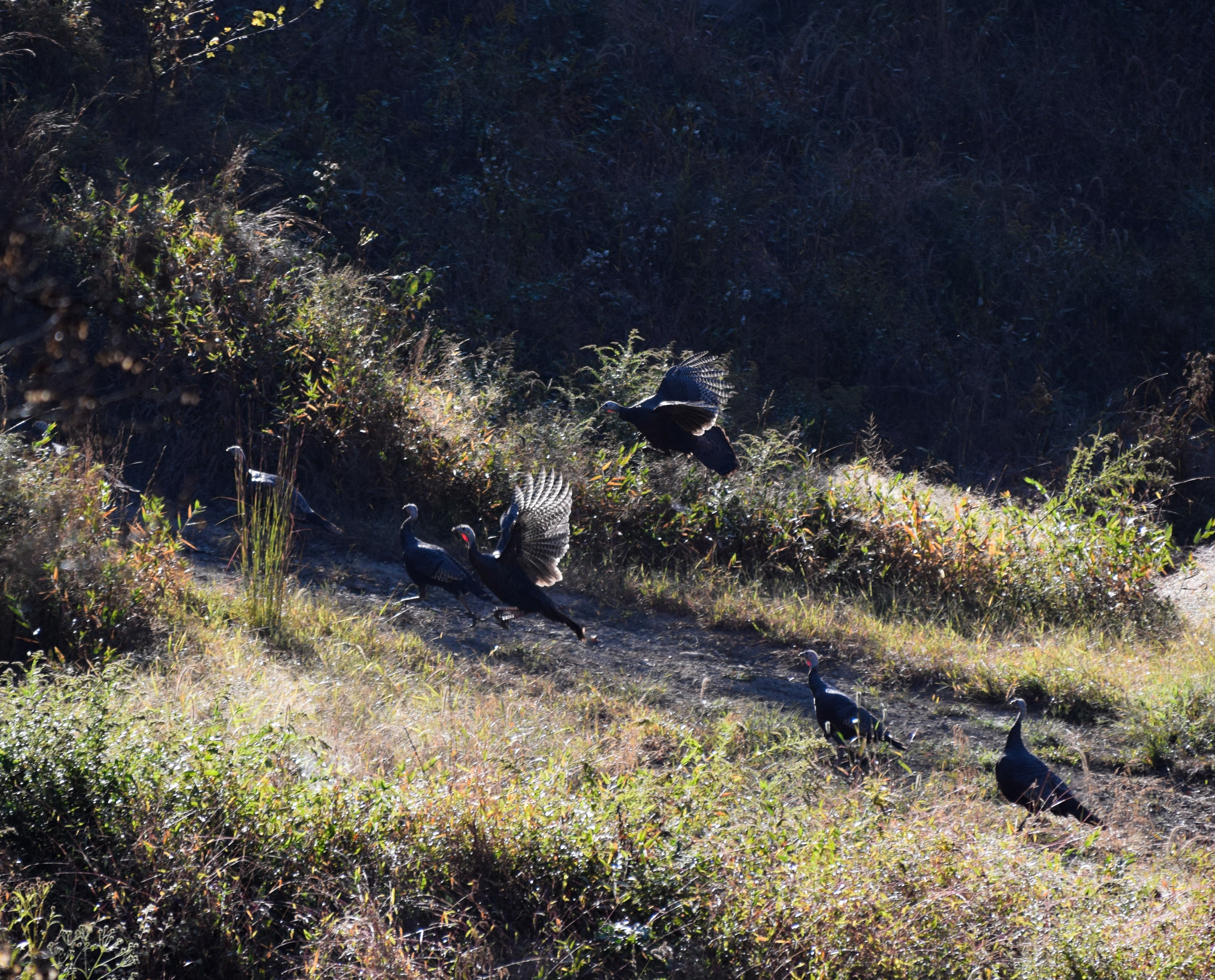 Turkeys were the same. I saw two flocks. One was in a field behind some houses as I was driving home. The other flock yielded about 18-22 birds. A humorous event occurred with two of the birds. The two young turkeys were on a dead limb. I managed two photos when the limb snapped. The birds fell a foot or so before remembering they had wings and soared off.