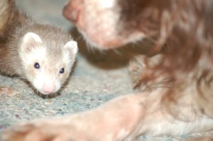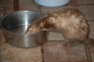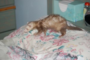 Quincy was a bad boy in his younger days. He hated closed doors and would scratch the carpet at times in an attempt to open the door. Another trait he had was when play time arrived he may scratch at your feet as to tell you; C’mon let’s play chase. He loved big envelopes and plastic grocery bags. Quincy would crawl into them and push them ahead as he moved across the carpet. He would sometimes do these ferret dances across the floor as he hopped and jumped.