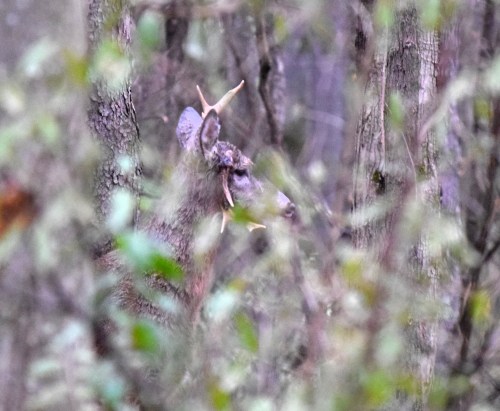 I saw several squirrels and heard some swans and a Ring-necked Rooster. I saw a lot of chickadees and juncos feeding heavily in the brambles. Unfortunately, or fortunately, I didn’t see any bear on this jaunt. On the positive side I did learn a lot more about the lay of the land. Upon coming home I checked my trail cam. Bucks…I get buck photos of three different bucks almost every night. I small-racked buck enjoyed rubbing my tress last evening.
