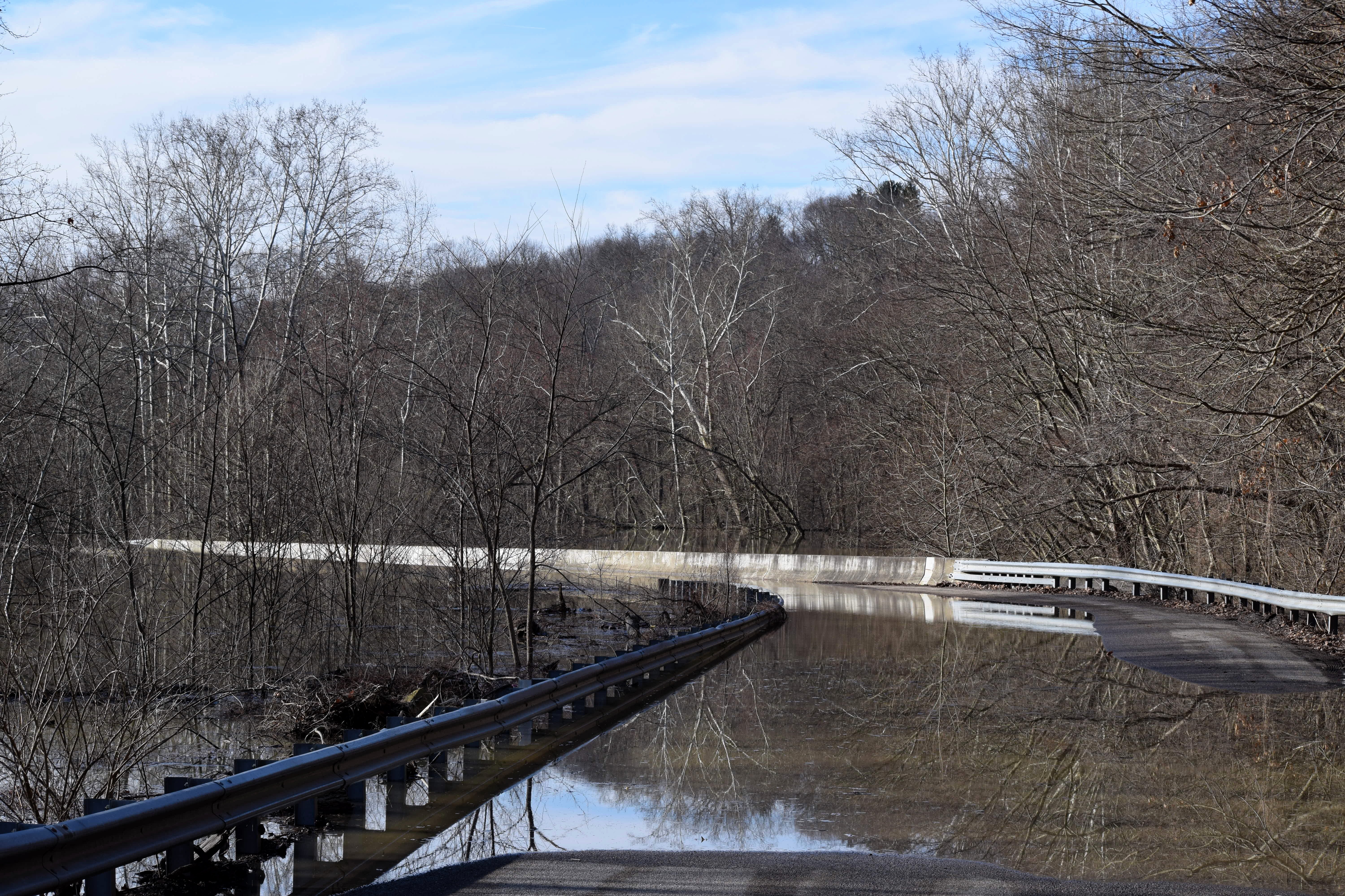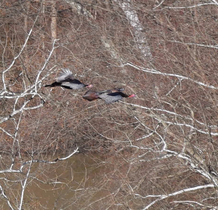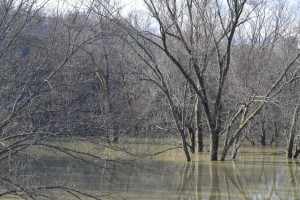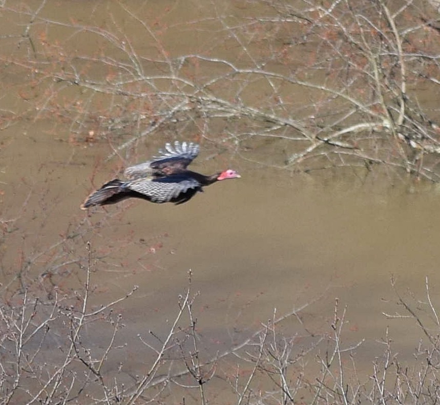As part of this day’s jaunt I elected to walk some of the Baker Trail which runs through the Cochran’s Mill area. One can walk along a steep and high hillside and view the flooding. Here I was fortunate to see a flock of turkeys flying over the watershed. The flock consisted of around twenty birds.