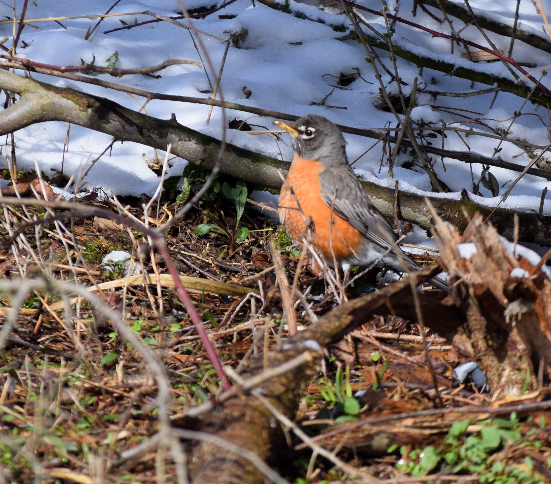 A lot of birdlife was viewed. Besides Robins many Juncos and Song Sparrows were out and about. I saw a pair of Mallard Ducks on a pond and a Great-Blue Heron. A Red-tailed Hawk finished the view. A number of crows, apparently, had an owl secured in a pine. The raucous they created would have waken up the dead, so to speak.