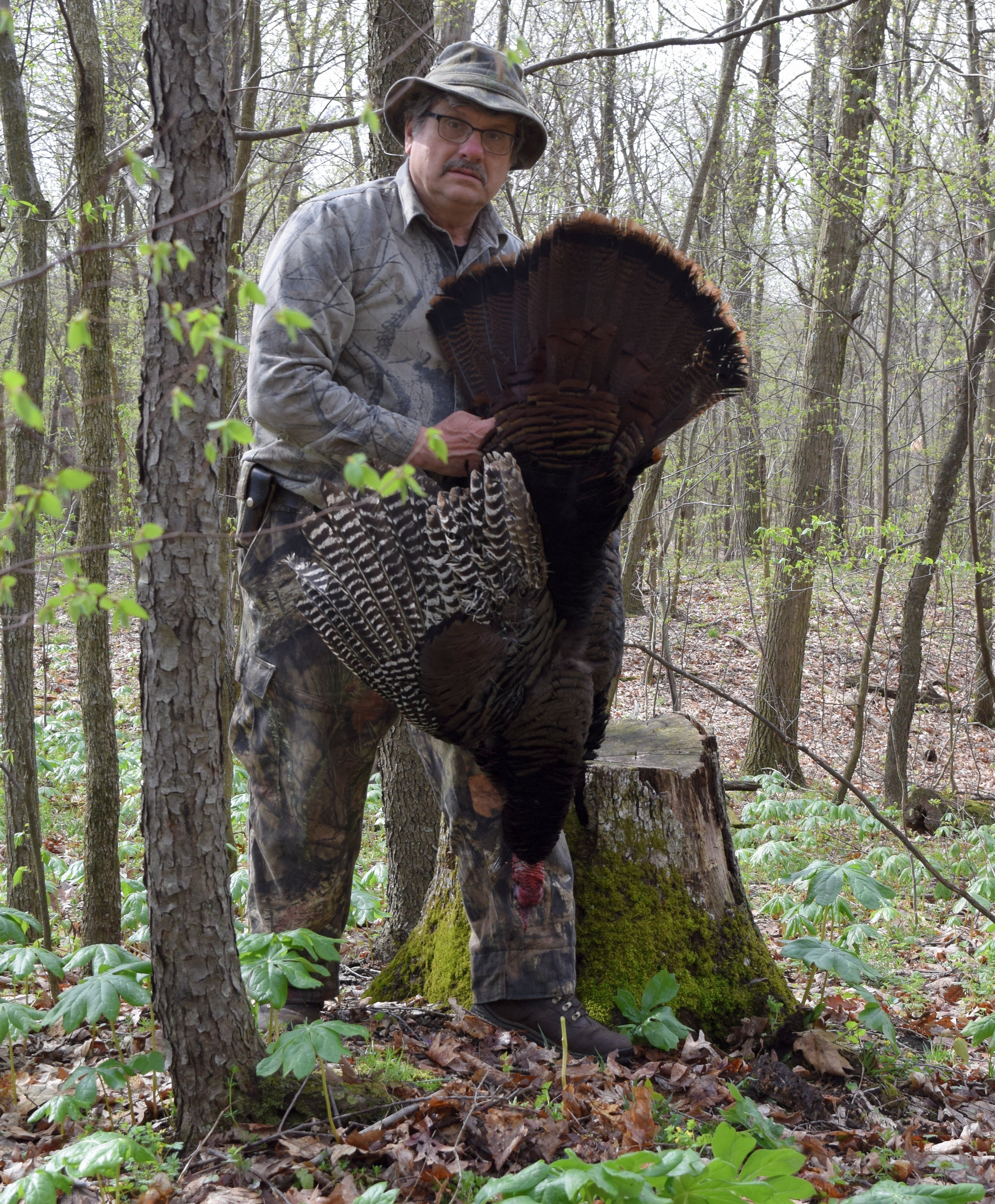 The temperatures were climbing by this time and I knew the grass needed mowed. I came out of the small woodlot and called as I began descending the hill. I still called occasionally. Suddenly, there he was! Too late now. Why did this gobbler gobble from across a hollow approximately a half mile across and shut up once I arrived? I’ll never know.