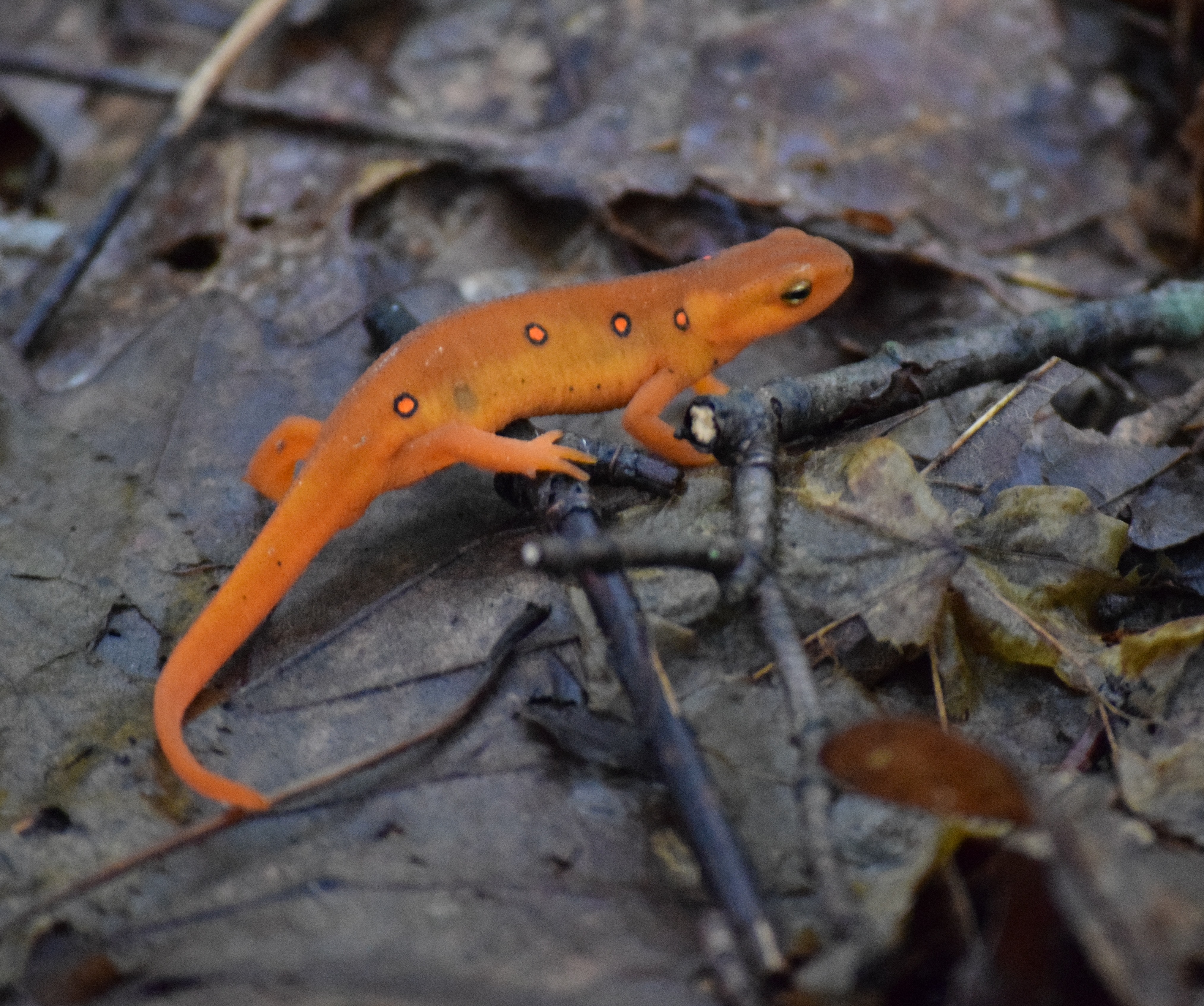 One interesting discovery were five different Red-Spotted Newts along the rim of the steep hill. The newts are the land stage and they will become aquatic later. I saw six or so deer throughout my morning jaunt. I only saw one squirrel. A Cooper’s Hawk fluttered from a high tree. At one site I saw vultures flying around, but five were settled in an old snag trying to keep dry enough for future flights.