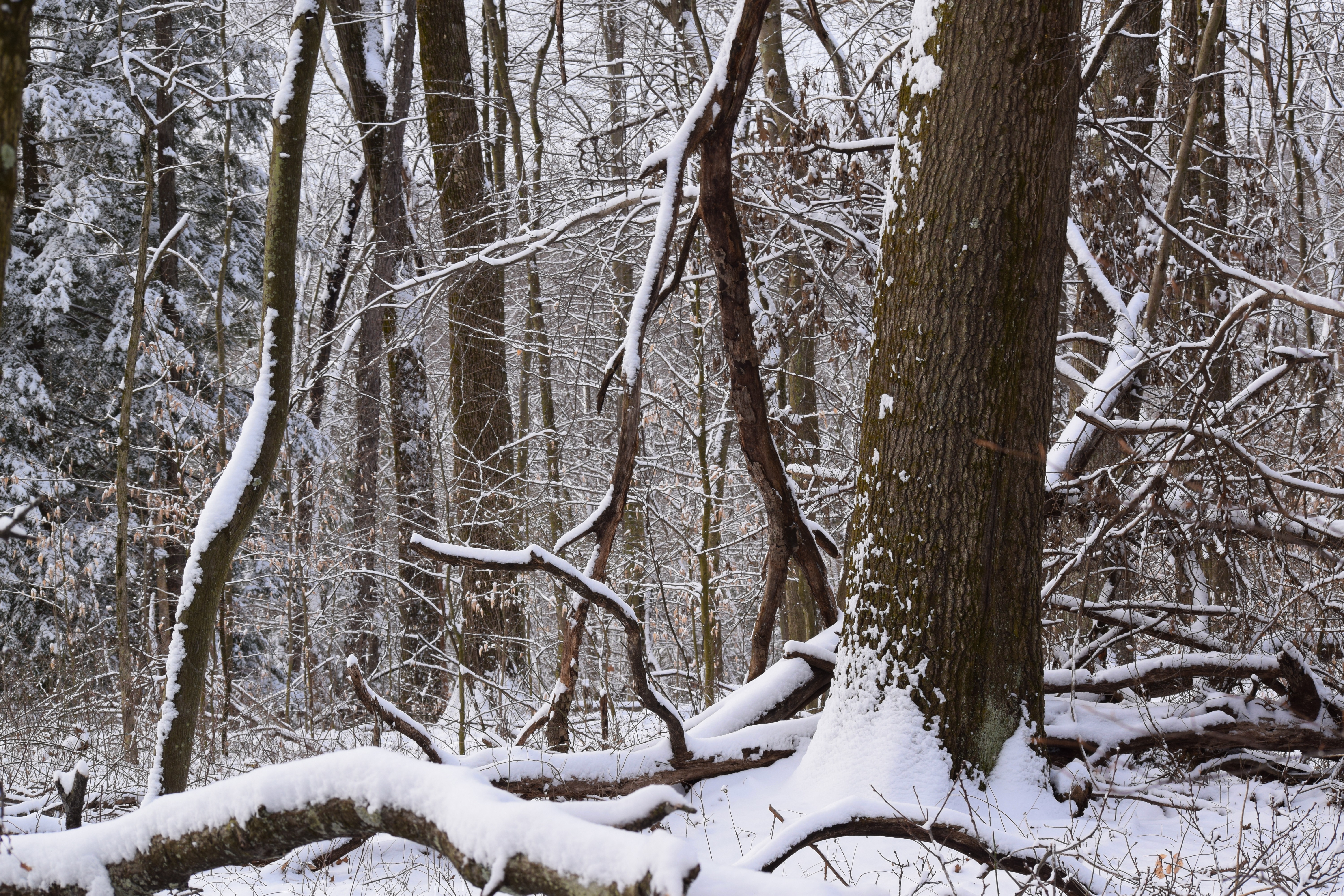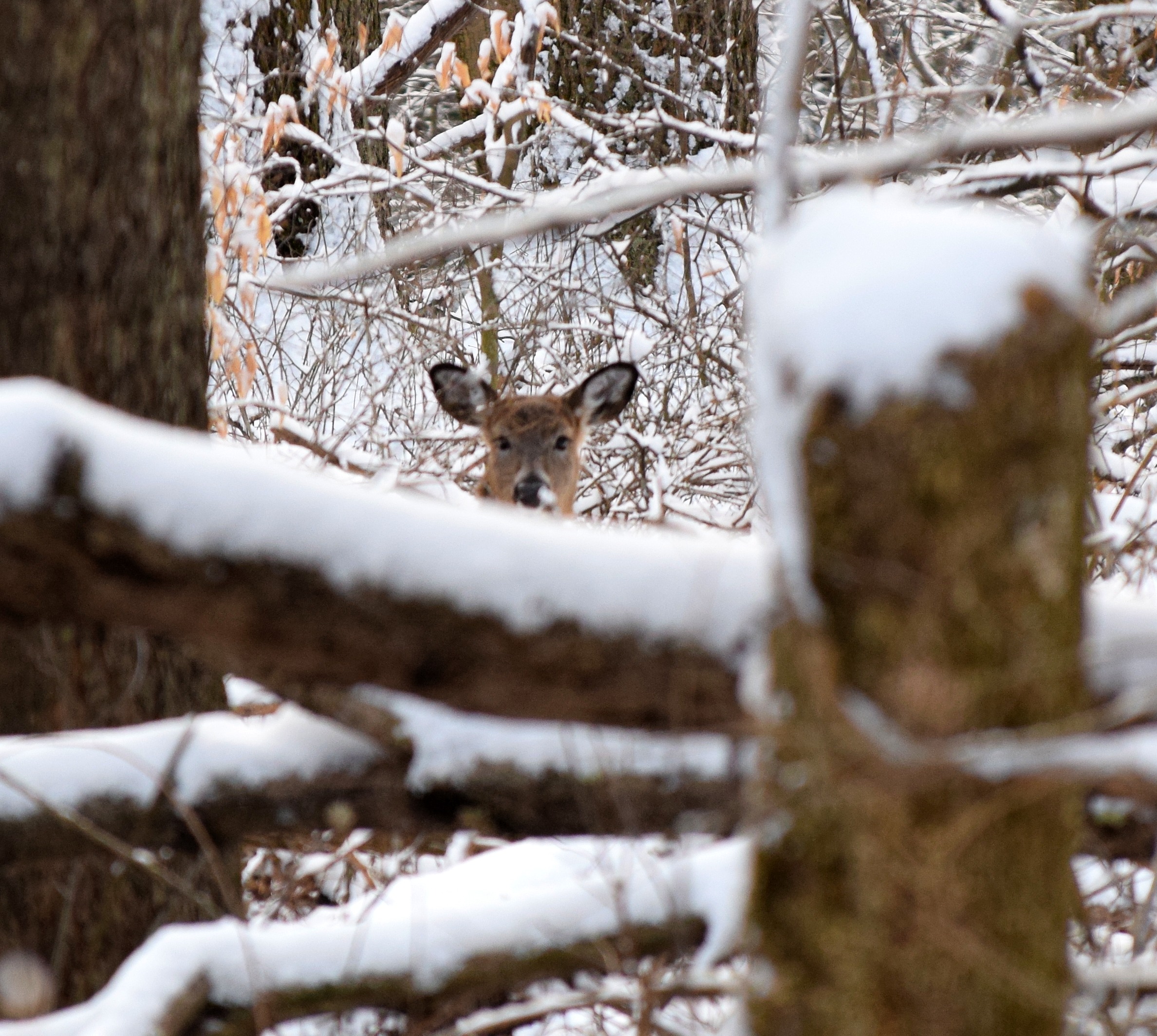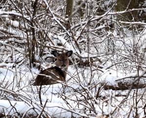 Deer tracks were numerous as I moved along. Fortunately, I spotted a deer bedded down among the fallen trees. I quickly located three more. I clicked some phots and moved on without spooking any of the three deer.