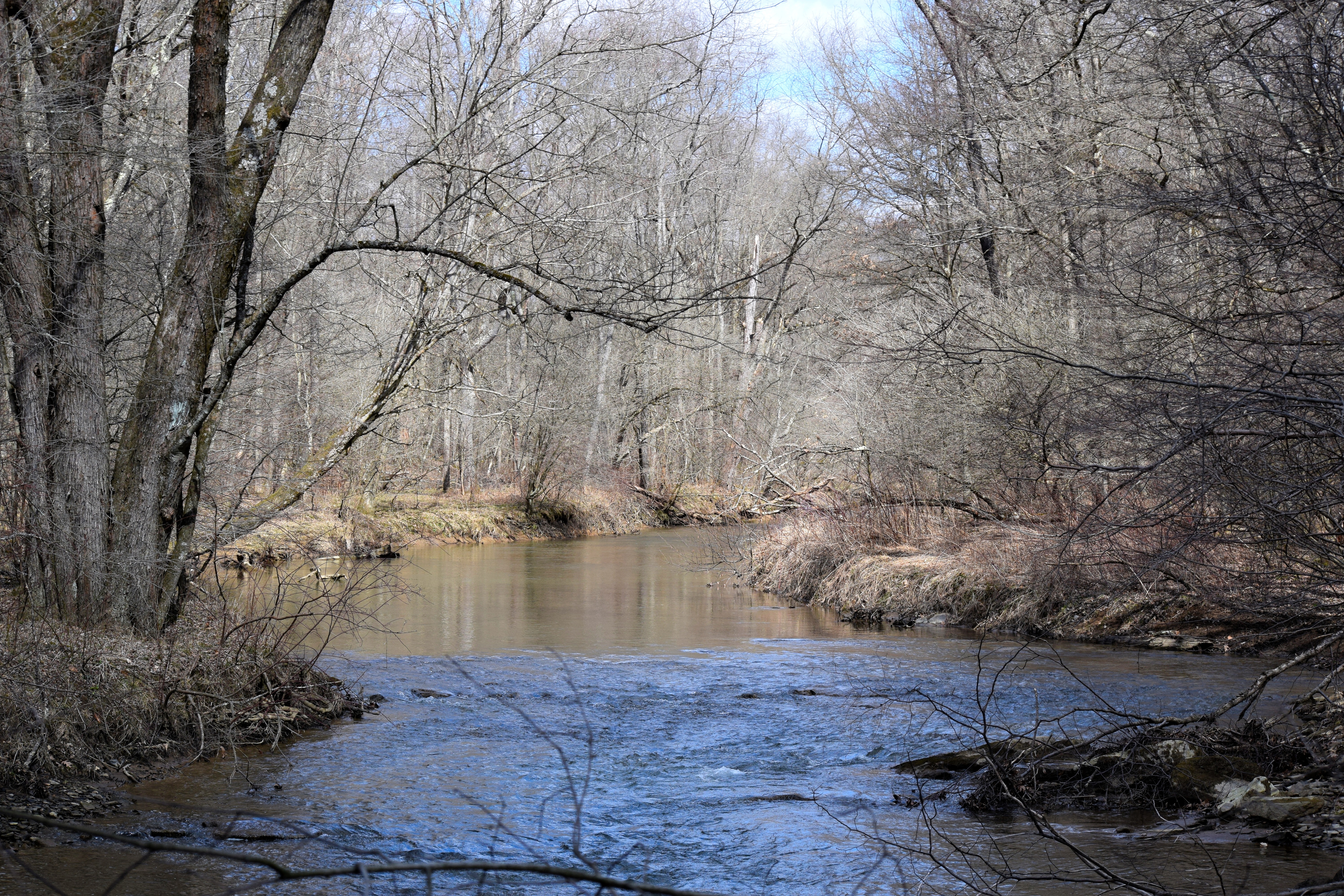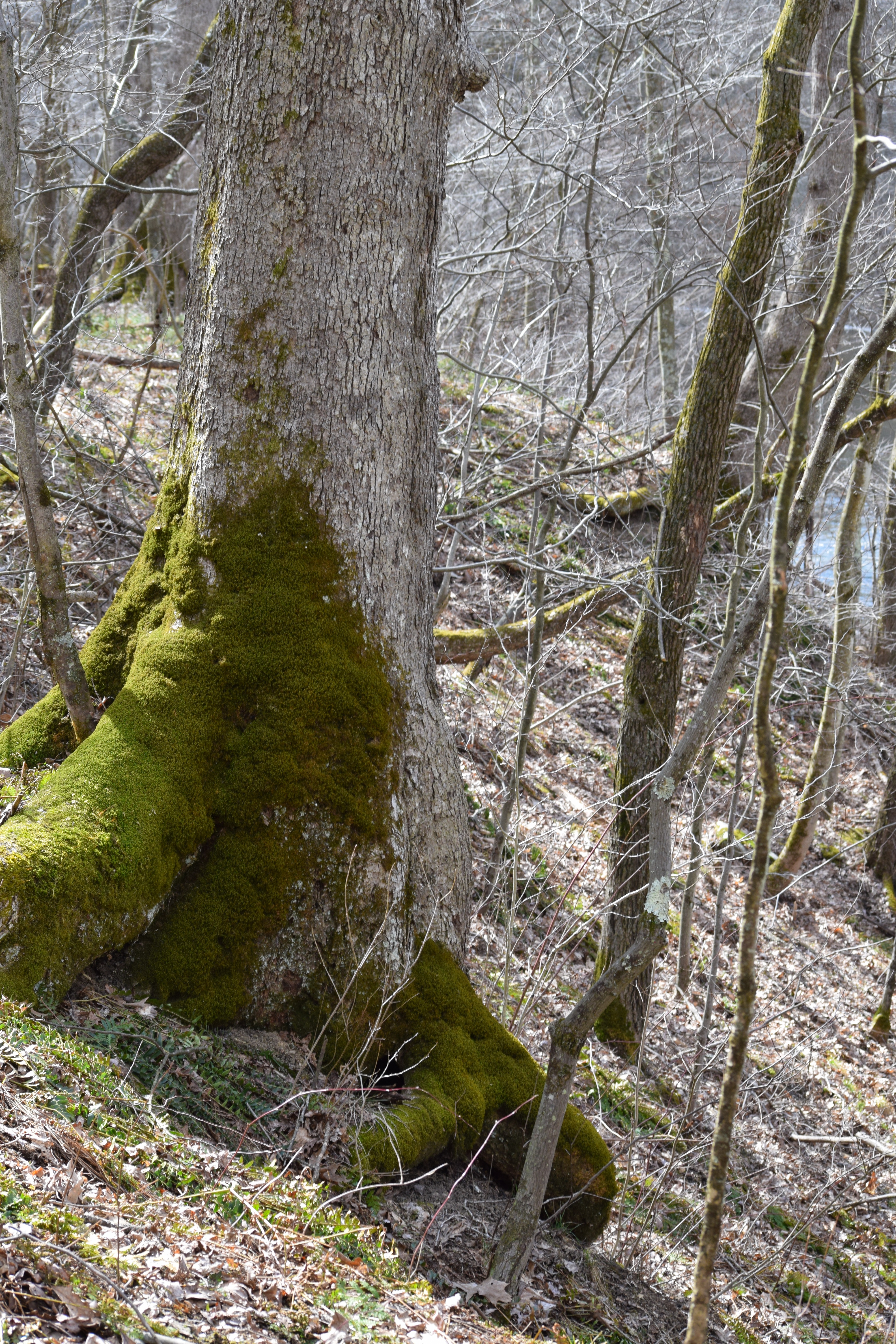 I walked down a slope and eventually walked alongside to Buffalo Creek. The creek was beautiful. As I walked along I went upslope before hearing the distinct sound of a hen turkey. She began yelping, cackling loudly followed by others. In short order a gobbler or two began gobbling. Fighting with loud purring was heard as well. The wings were beating loudly as various birds pushed to maintain or gain positions in the pecking order. The birds were across the creek. I eased slowly in their direction and eventually could see turkey movement about a hundred yards away.