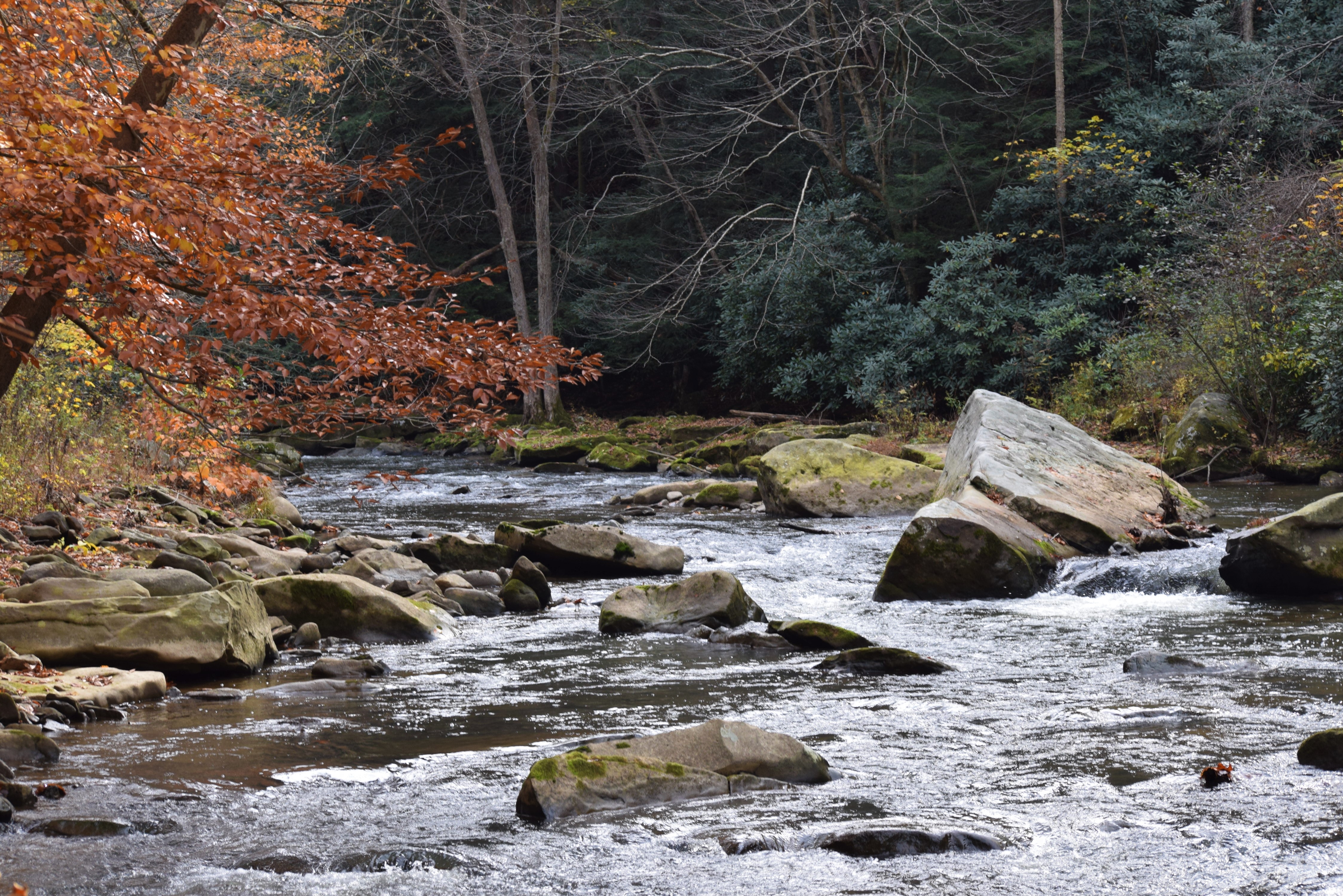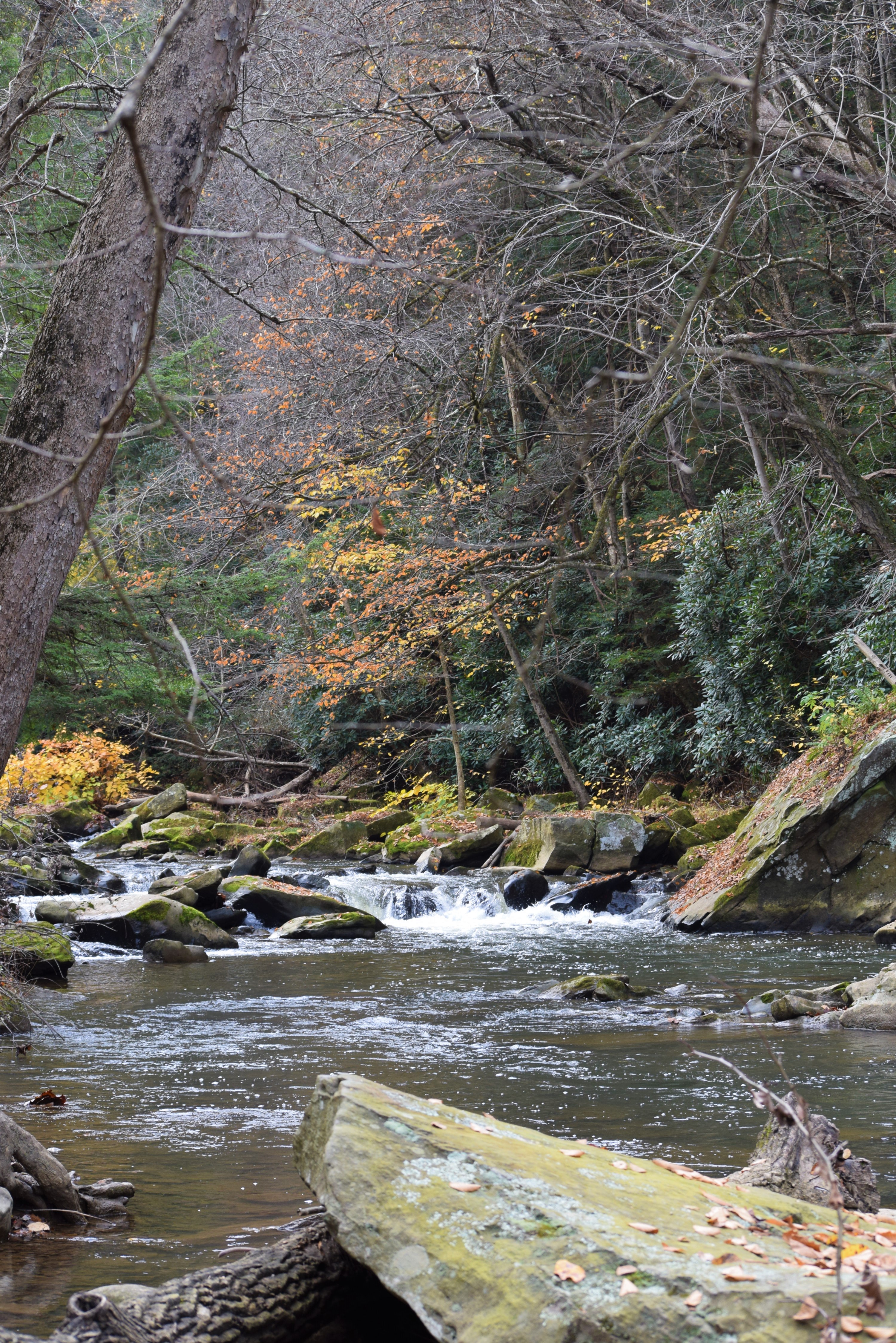 ever I could , along the creek’s edge snapping photos everywhere. This waterways has many boulders and hemlocks and rhododendrons. Add beech and maple and the contrast was breathtaking. I was forced to gather a stck as a third leg for the many rocks where slippery for this old man with painful knees.