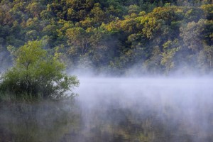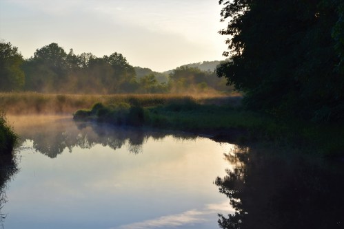 I was on the move early for I wanted to be somewhere along Keystone Lake to watch the sun rise. (Keystone Lake is in Armstrong County, Pennsylvania.) I parked and walked along a narrow, old fishermen trail to get down to the water’s edge. Fog was over much of the lake, but not heavy enough to cancel out seeing the water. I began to take photos wherever I could do so. Vegetation was dense and to the shoreline in many places. I was surprised as to how high the trees had become at many places.