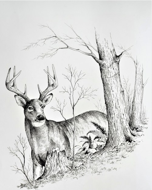 The second art is a pen, ink and pencil buck called “The Side of the Mountain”. I have been going through my file cabinets and I found a small sketch I did many years ago of a buck walking alongside the hill. I sketched the art originally while I was still at work. I often walked around at lunch time and sketched down ideas. Some were kept apparently, but most were discarded upon study.