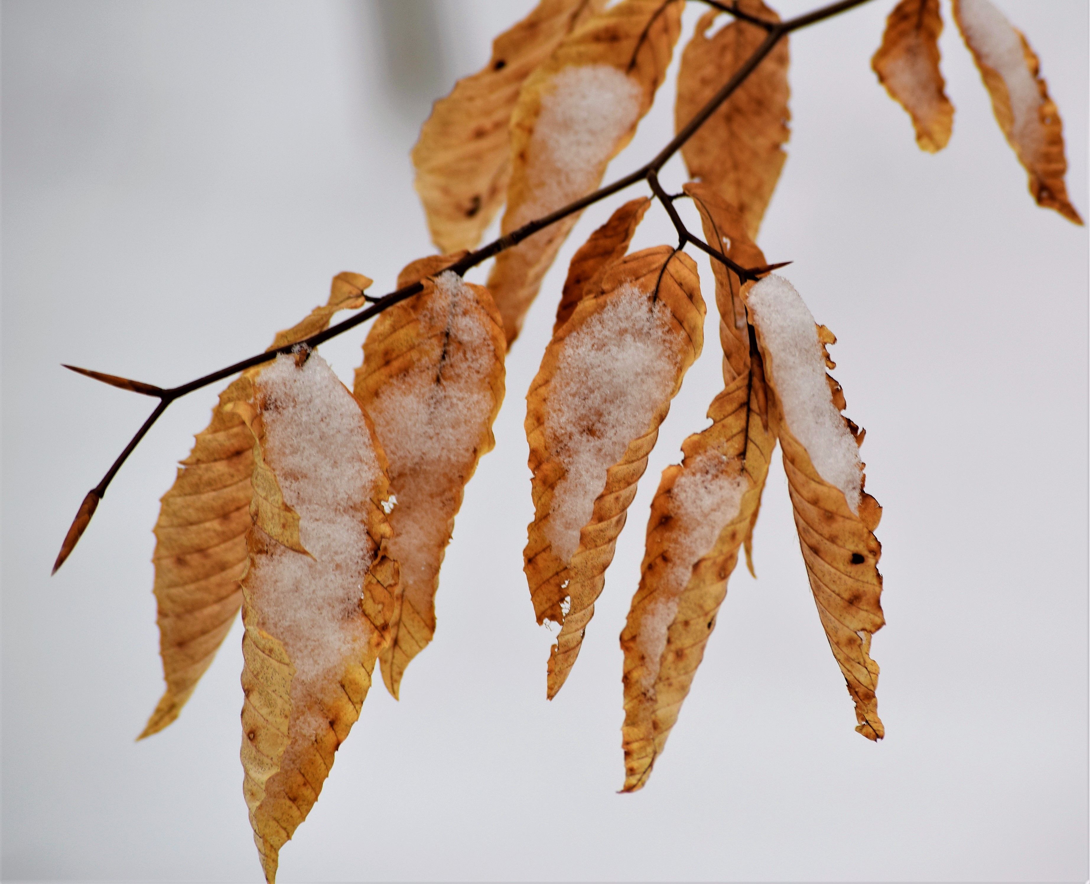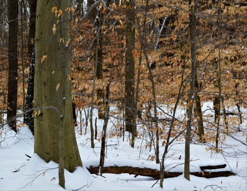 The Beech trees shown in the photo carry last year’s leaves throughout winter until te time of new leaf growths begin. The orange leaves make for a nice contrast against the snow.