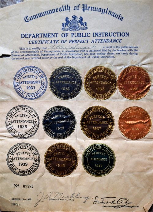 The document below is of interest to me. My dad had perfect attendance at the Elderton High School. He was awarded this document and a small gold colored trophy for his efforts. He graduated in 1941 as valedictorian. His son didn’t fare as well. I did well in school, actually in my junior year with an average leading to third place. I even made the Honor Society. Who would have “thunked” it! My senior year I slipped.