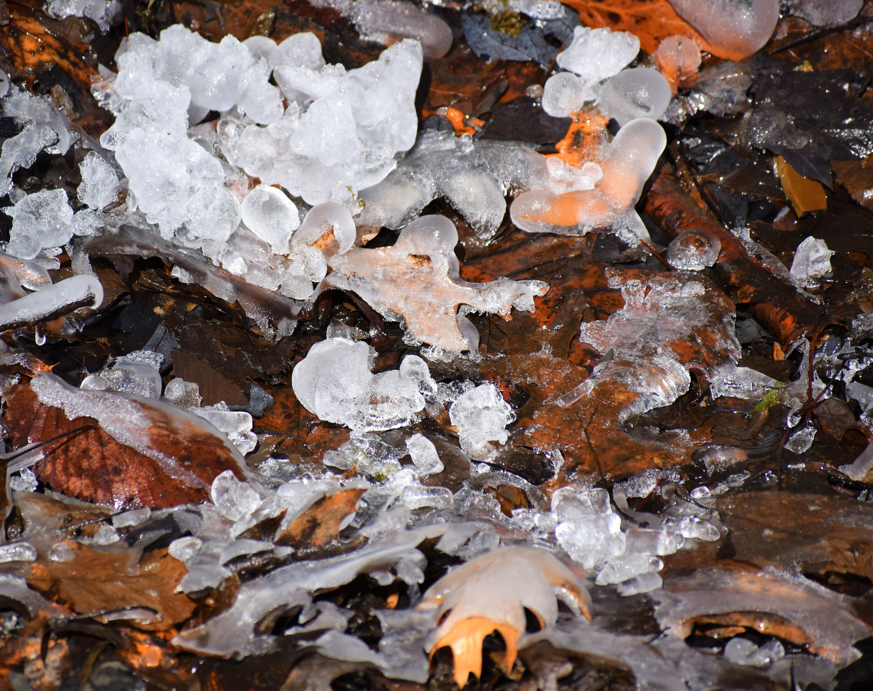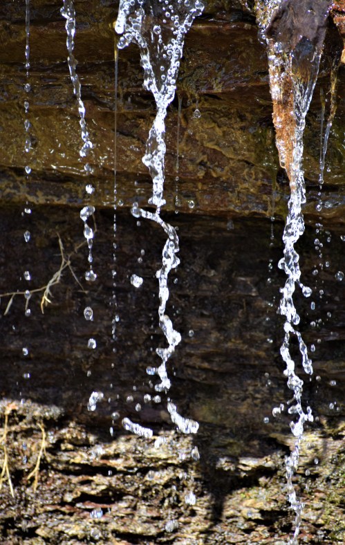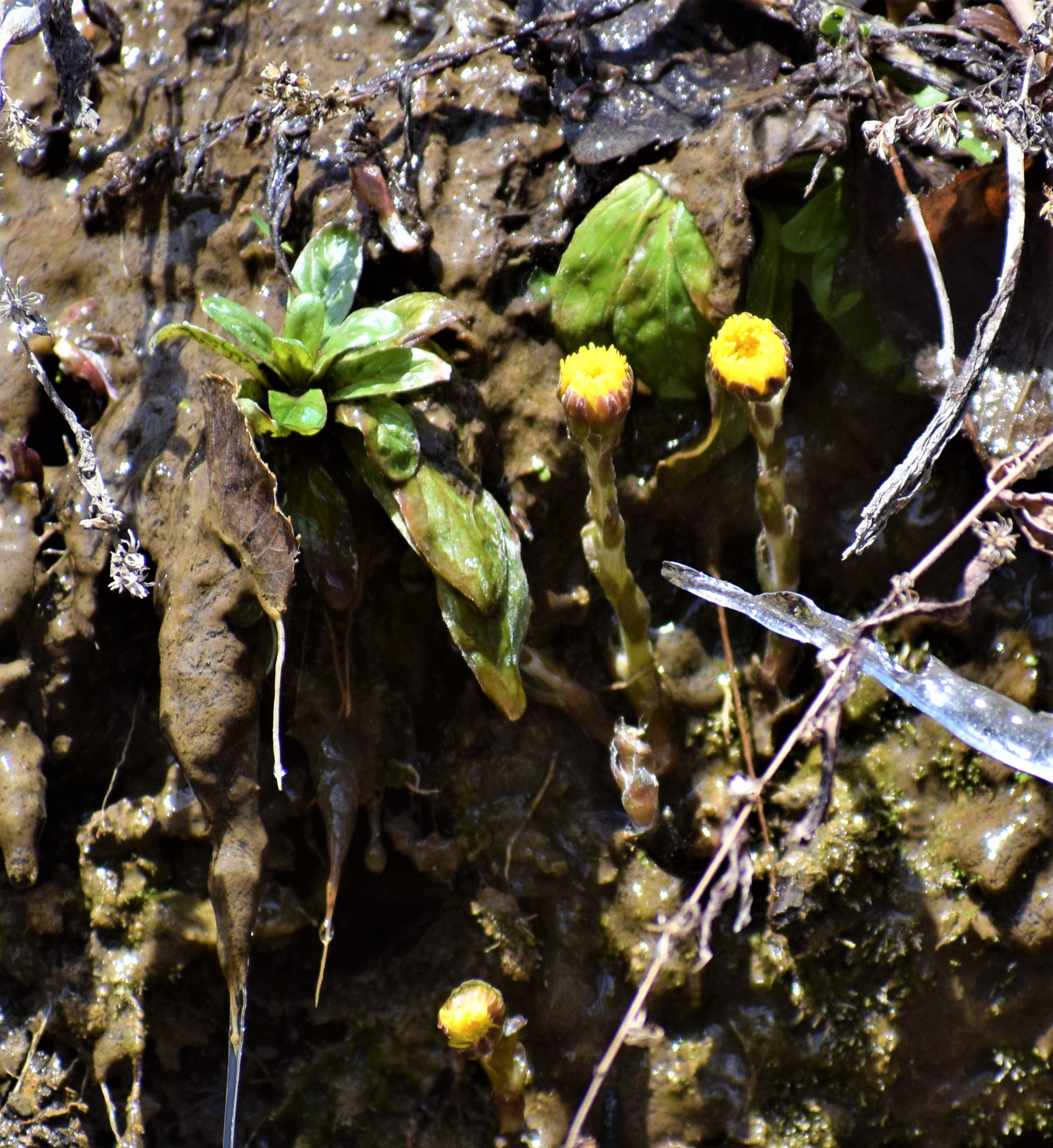 I walked along keeping aware of my surroundings. I noticed the Coltsfoot flower blossoms present, but not open. Remember the temperatures this morning was around thirty degrees. Ice was hanging from exposed rocks and a sheen of ice was present on areas of standing water.