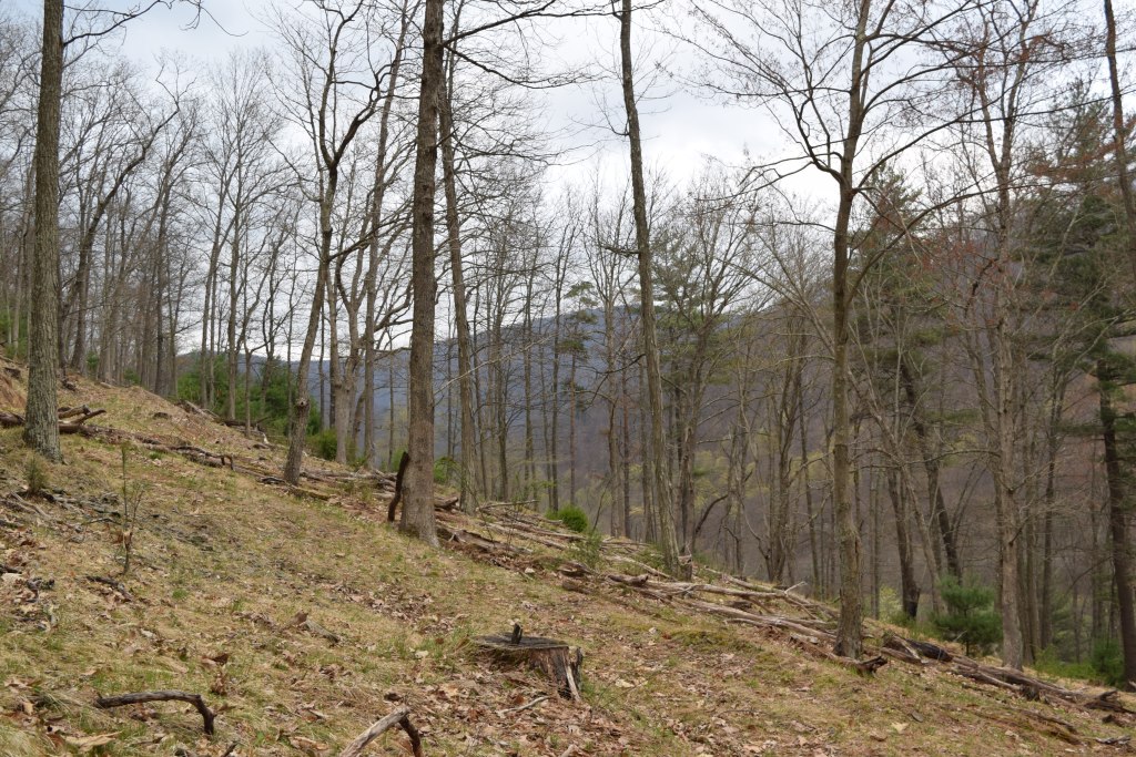 The mountain is covered with small rocks varying from four inches to a foot. Underbrush was rare. My reasoning for the rocks falls upon knowledge of the mountain’s history. Mankind of years past denuded the trees of these mountains. Also, with all the dead tree tops, fires were common. The trains would often throw out shouldering conditions causing fires. Once the ground had been devoid of trees and burned to the soil any heavy rains would quickly wash all the best top soil away exposing the rocks. Regaining quality topsoil is a very long process of nature.