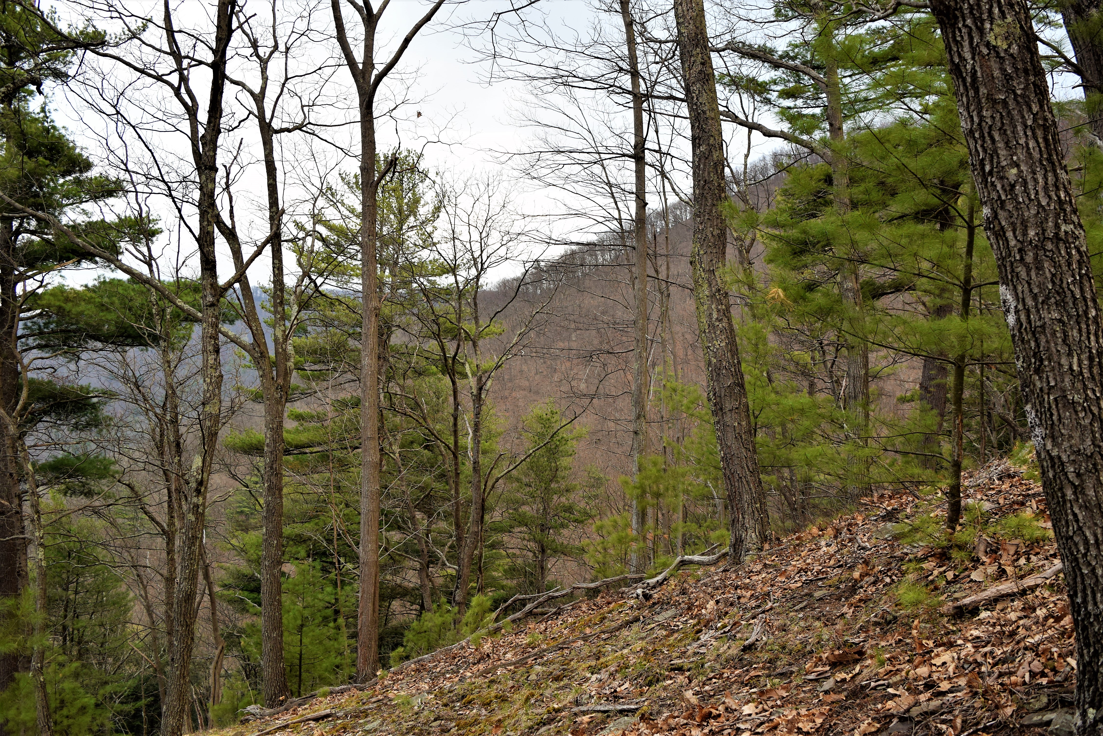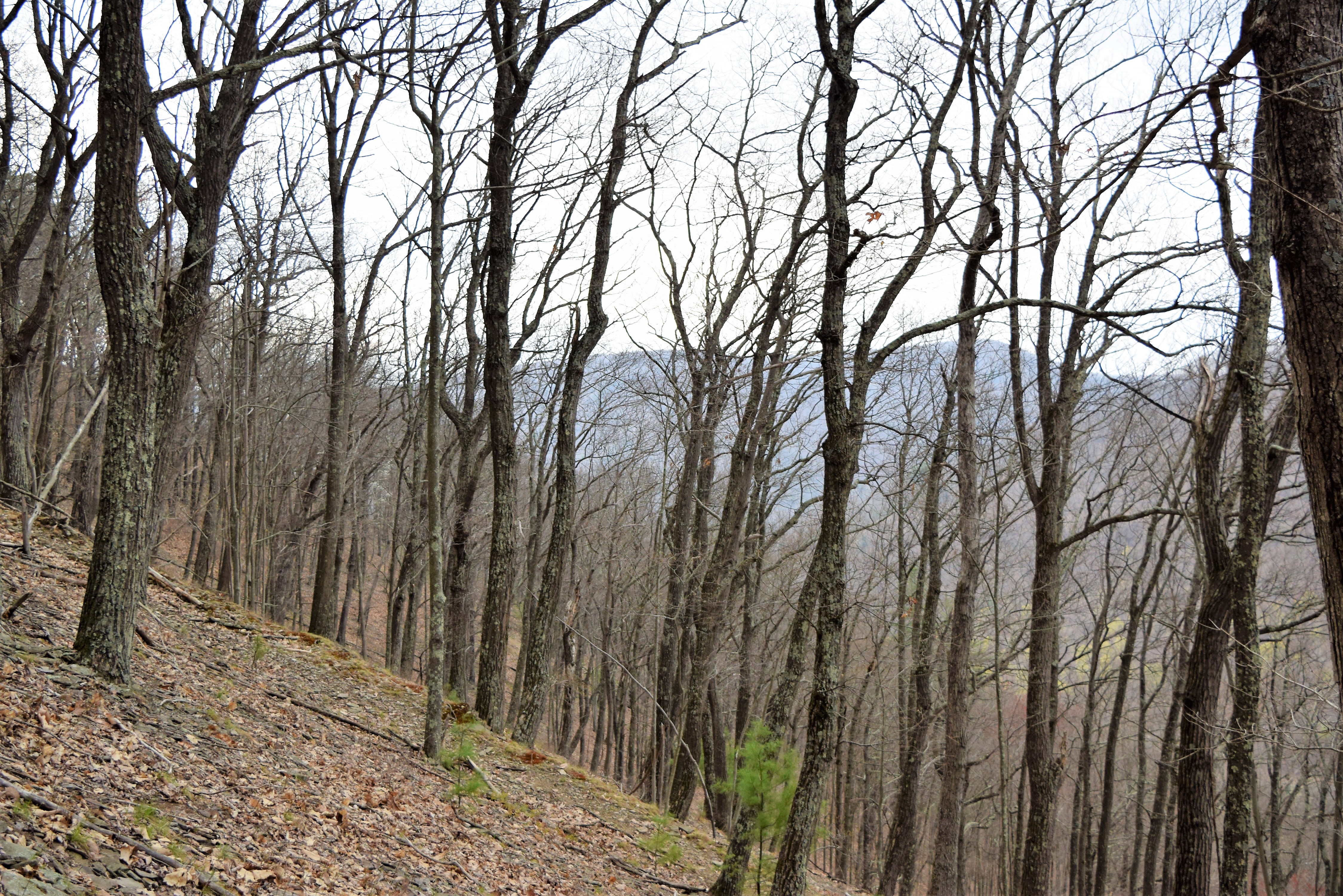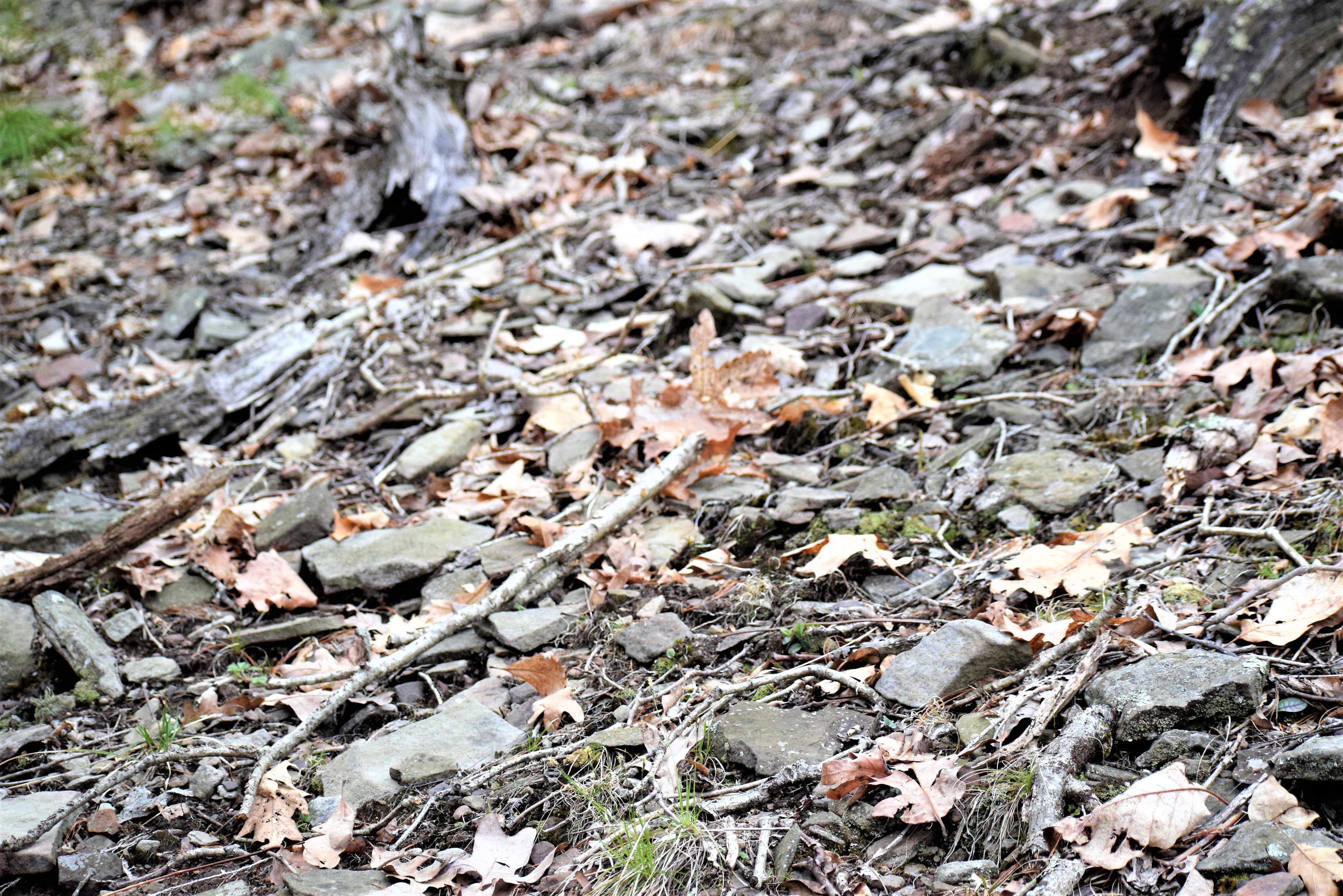 The mountain is covered with small rocks varying from four inches to a foot. Underbrush was rare. My reasoning for the rocks falls upon knowledge of the mountain’s history. Mankind of years past denuded the trees of these mountains. Also, with all the dead tree tops, fires were common. The trains would often throw out shouldering conditions causing fires. Once the ground had been devoid of trees and burned to the soil any heavy rains would quickly wash all the best top soil away exposing the rocks. Regaining quality topsoil is a very long process of nature.