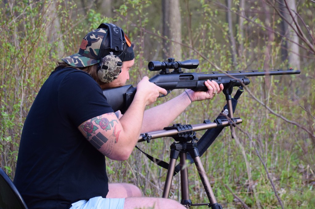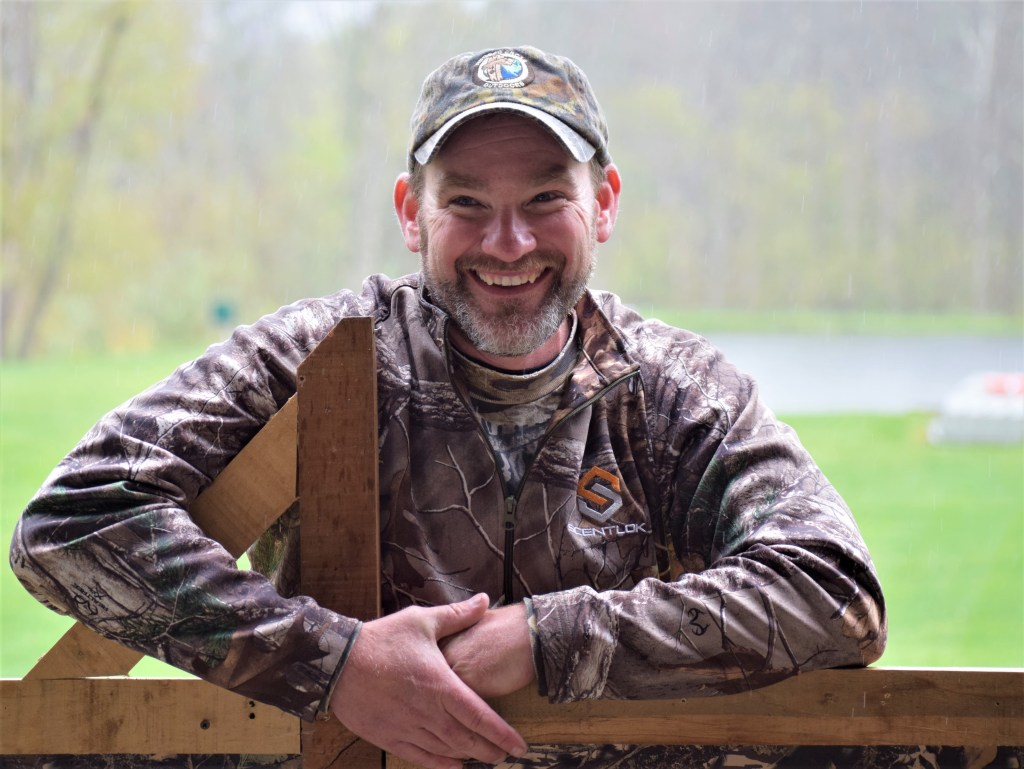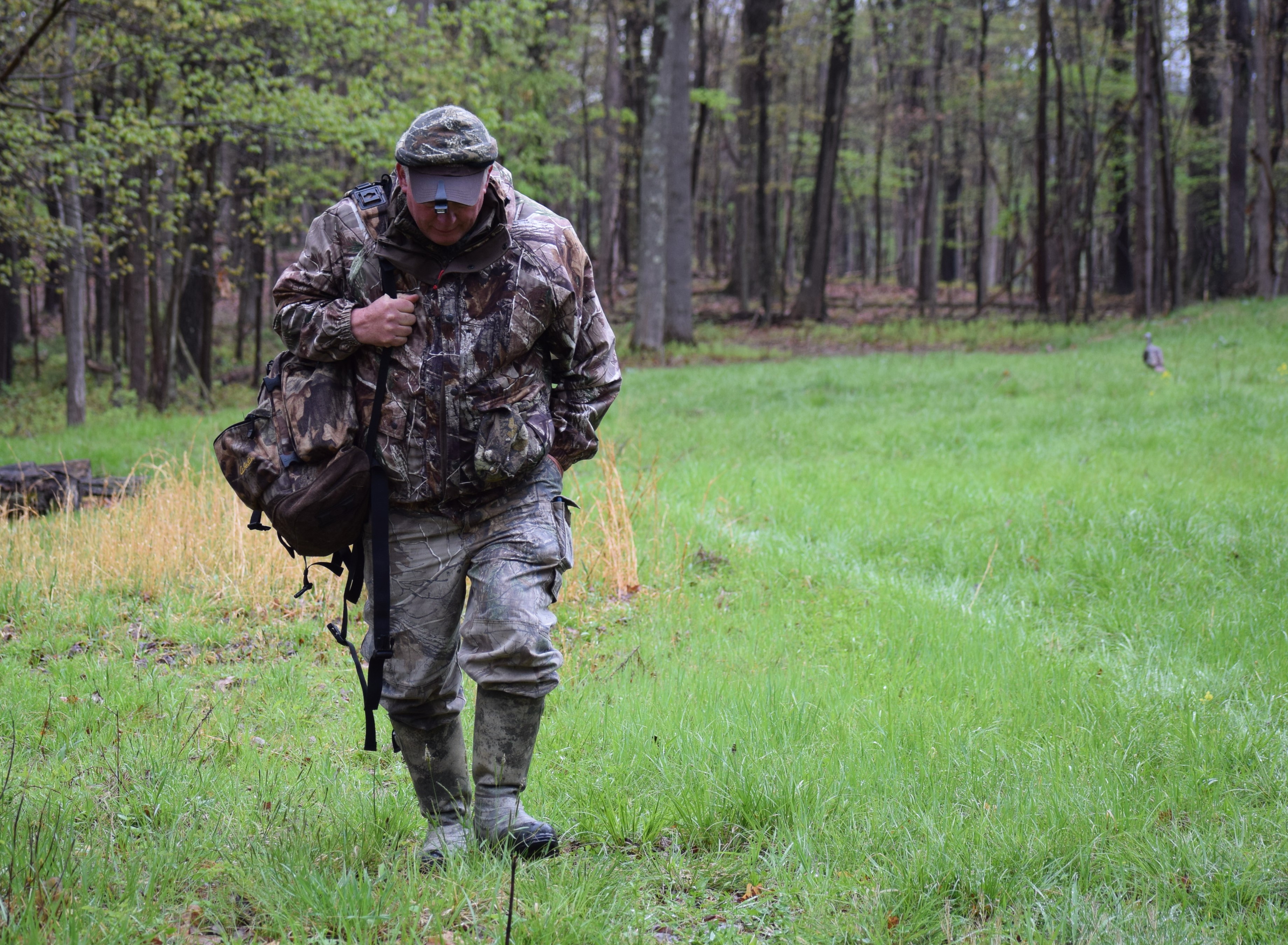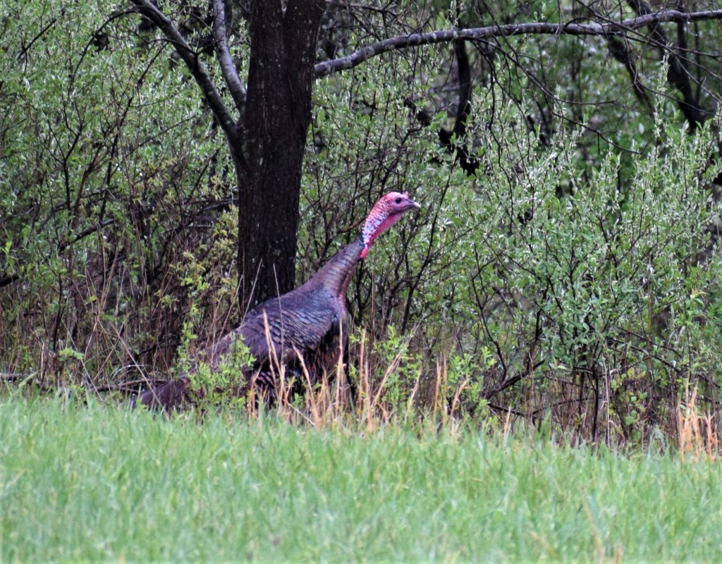 The following morning Dana Gould, Pat Covert of the Wounded warrior group, Rich Shillings and myself traveled to two pre-set blinds overlooking a grassy area. A hen decoy was set up. The wait would begin hoping to hear roosting gobblers. That hope didn’t happen. Rainy weather was the norm all the day. Rich periodically called as we watched. During the morning I saw a turkey head and neck in the woods about 70 yards, or so. The hen turkey came past us and temporarily challenged the decoy.