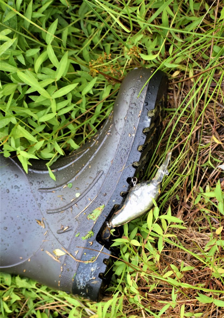 This morning had another first for me. My brand new, never-worn, boots were on my feet. I walked behind to the Nature’s Restroom, and noticed something shining among the vegetation. I had tramped upon a fishing lure and the one treble hook was firmly in place. I removed the boot to remove the plug and luckily the hook was in the thick bottom of the boot and not through the thinner material.