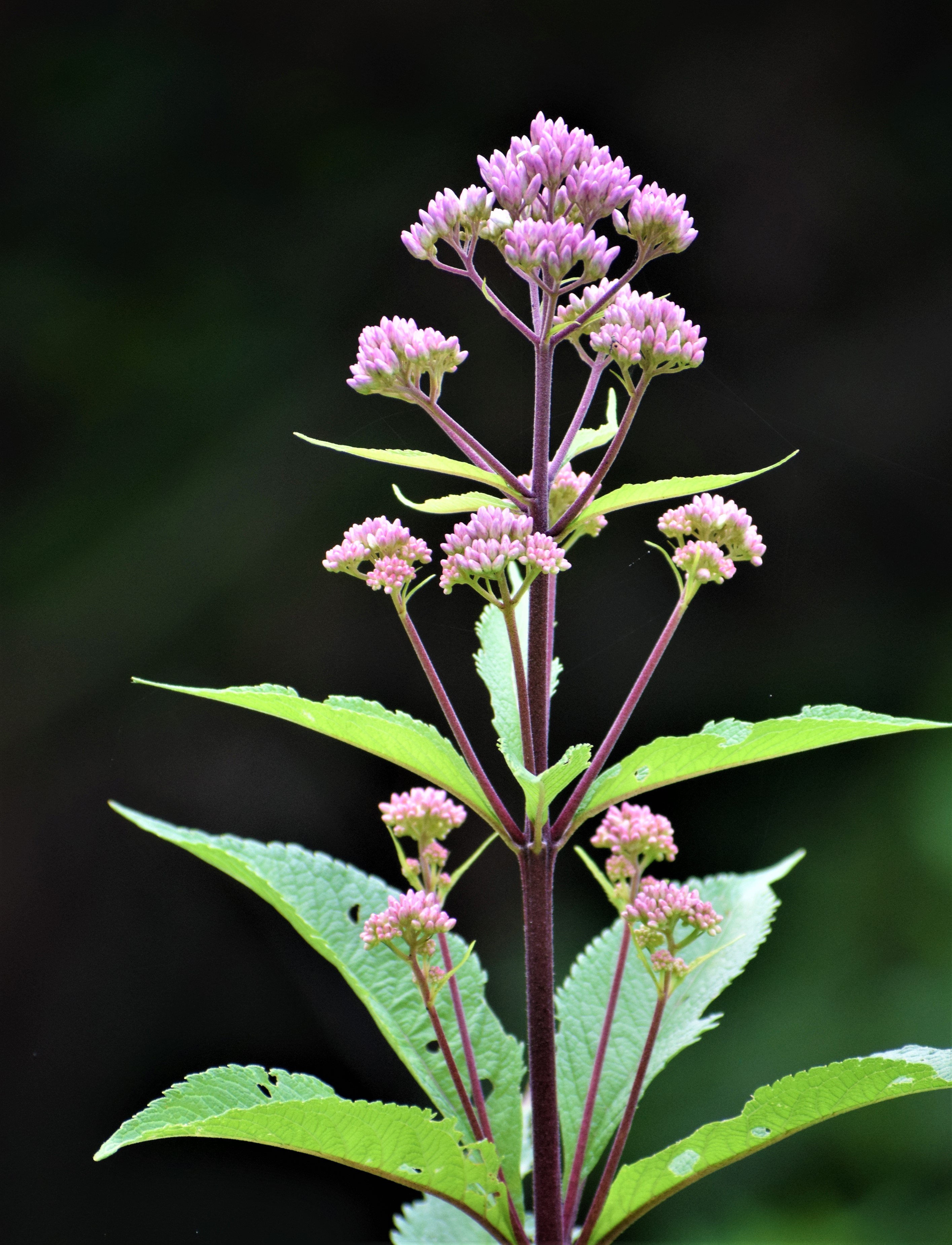 Joe-Pye grows high, probably, averaging as high as seven feet or so. the blossoms to me look like they are about to emerge into something bigger or more colorful. the purple stalk identifies this specie of Joe-Pye. bees and butterflies love them.