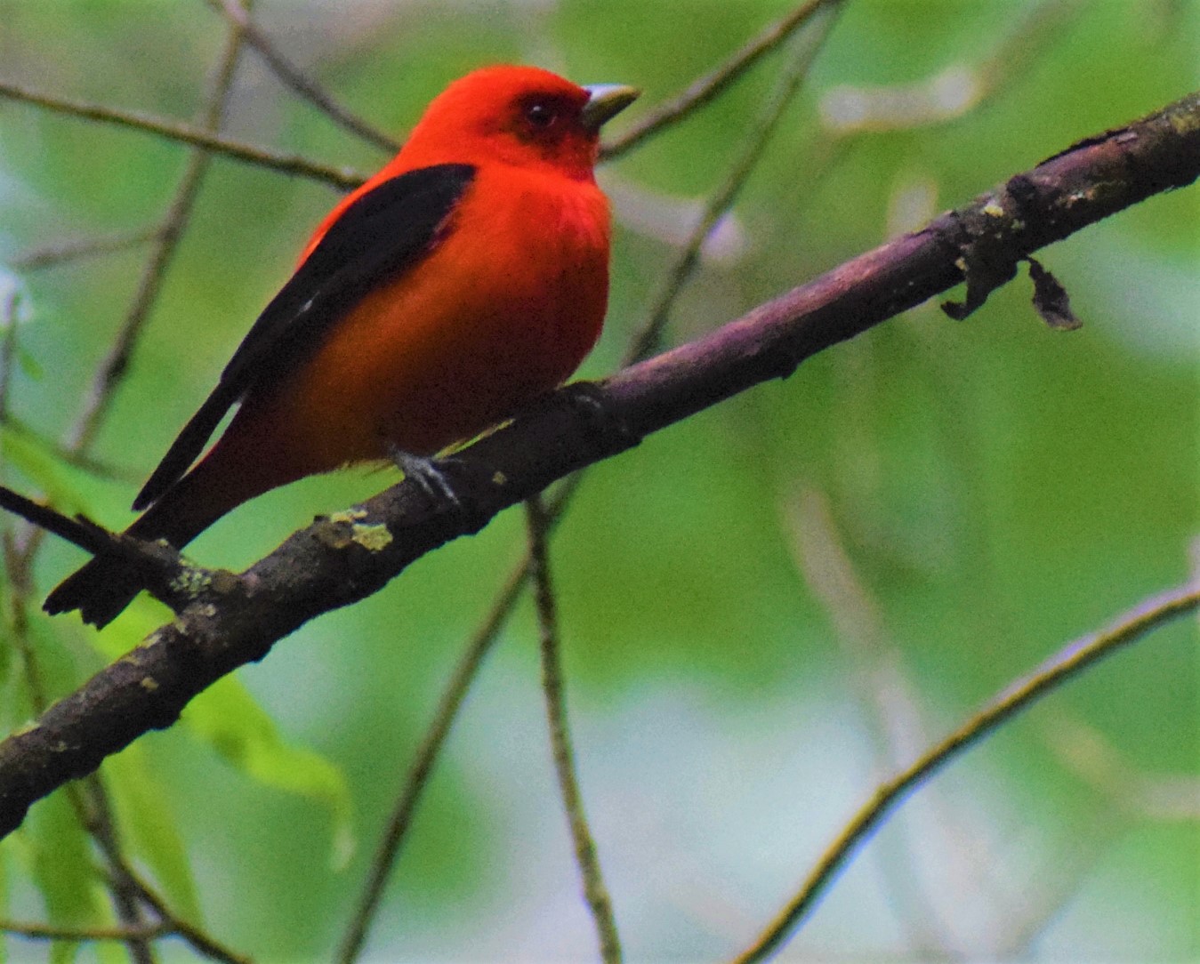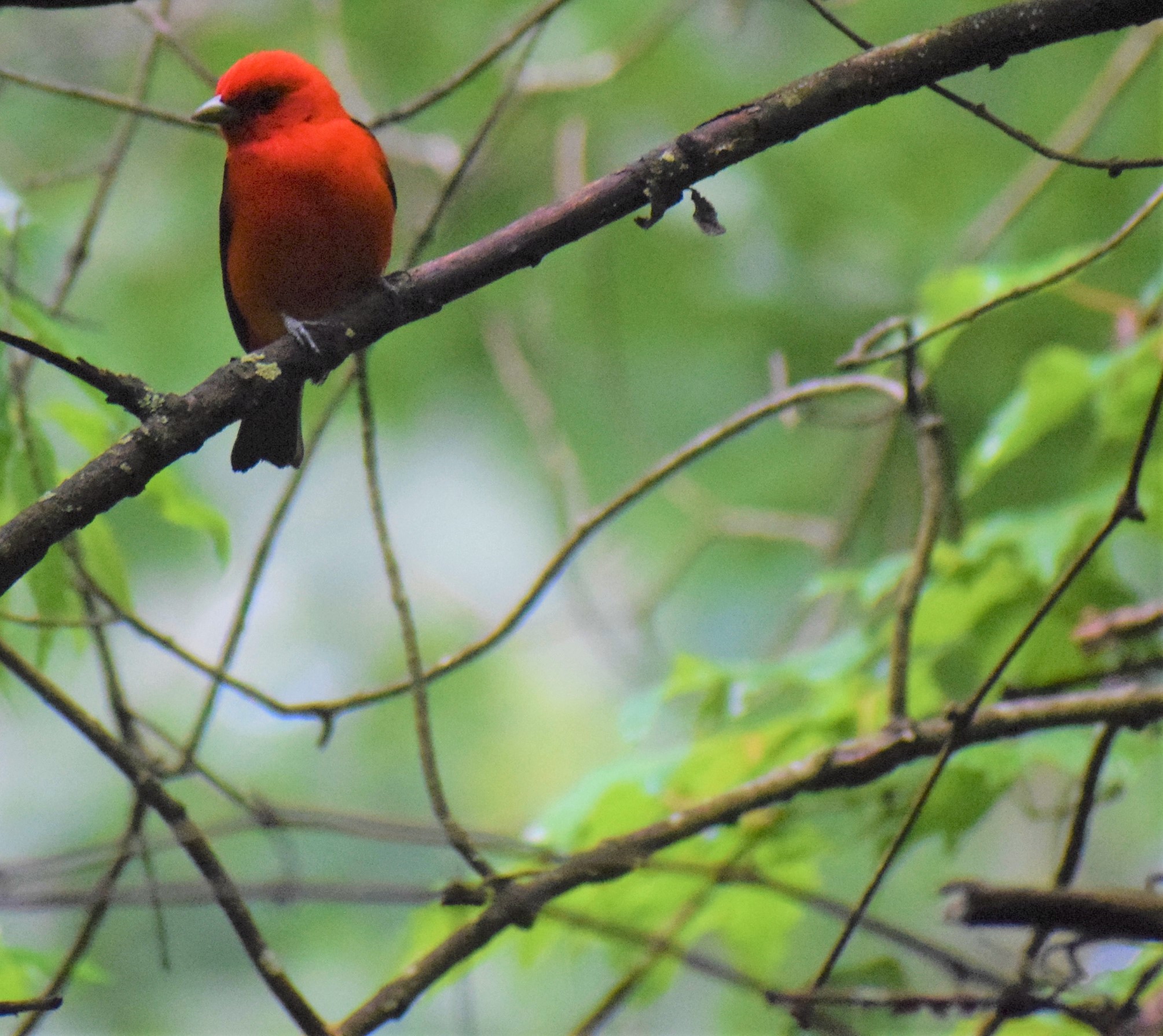 I was interested in what wildlife I may see this fine day. I saw a couple of deer; one had a fawn with it nursing. I saw some spring-time birds seldom viewed. The Scarlet Tanager is a favorite for the color red is vivid contrasting the black wings and tail. I managed to get a few pics of this beauty.