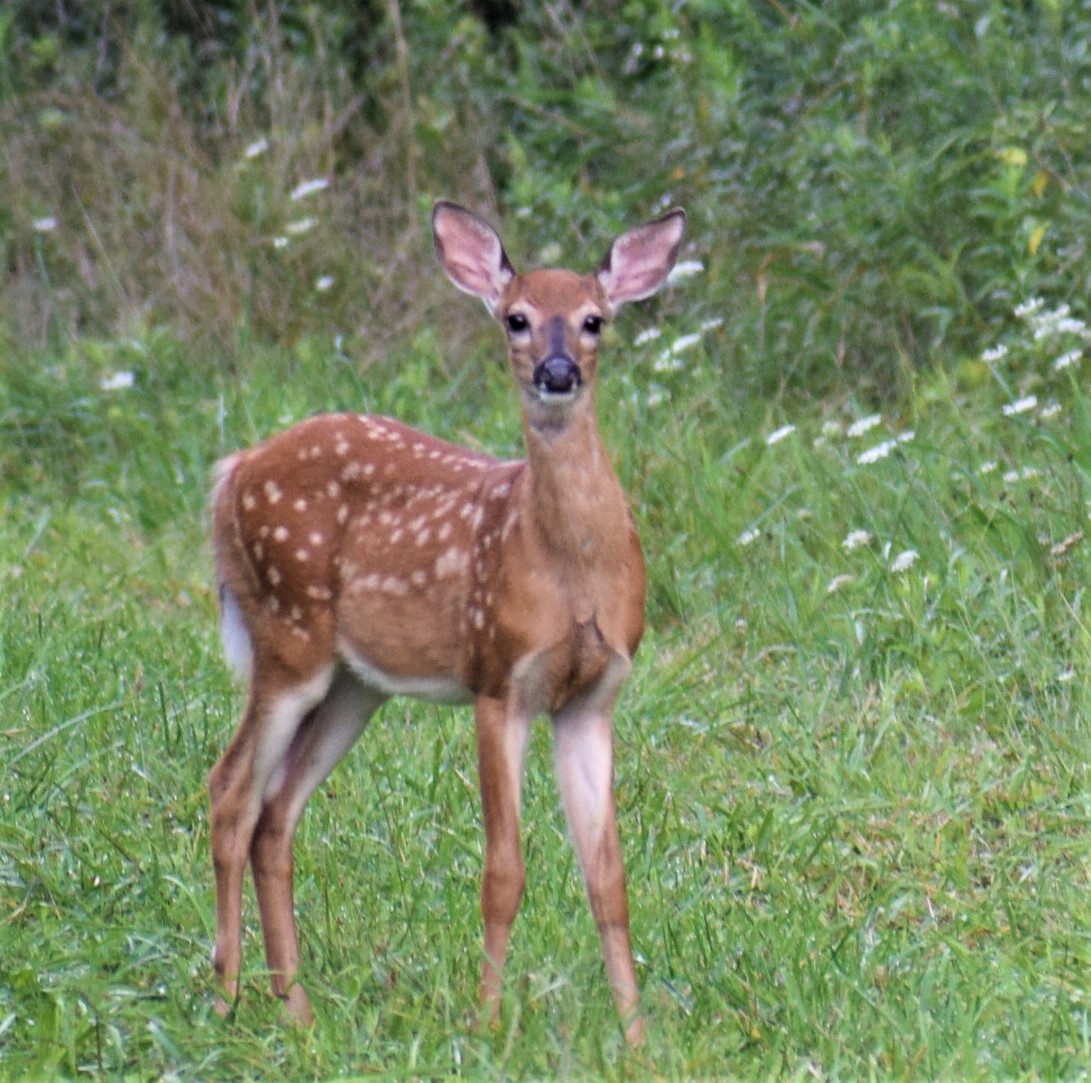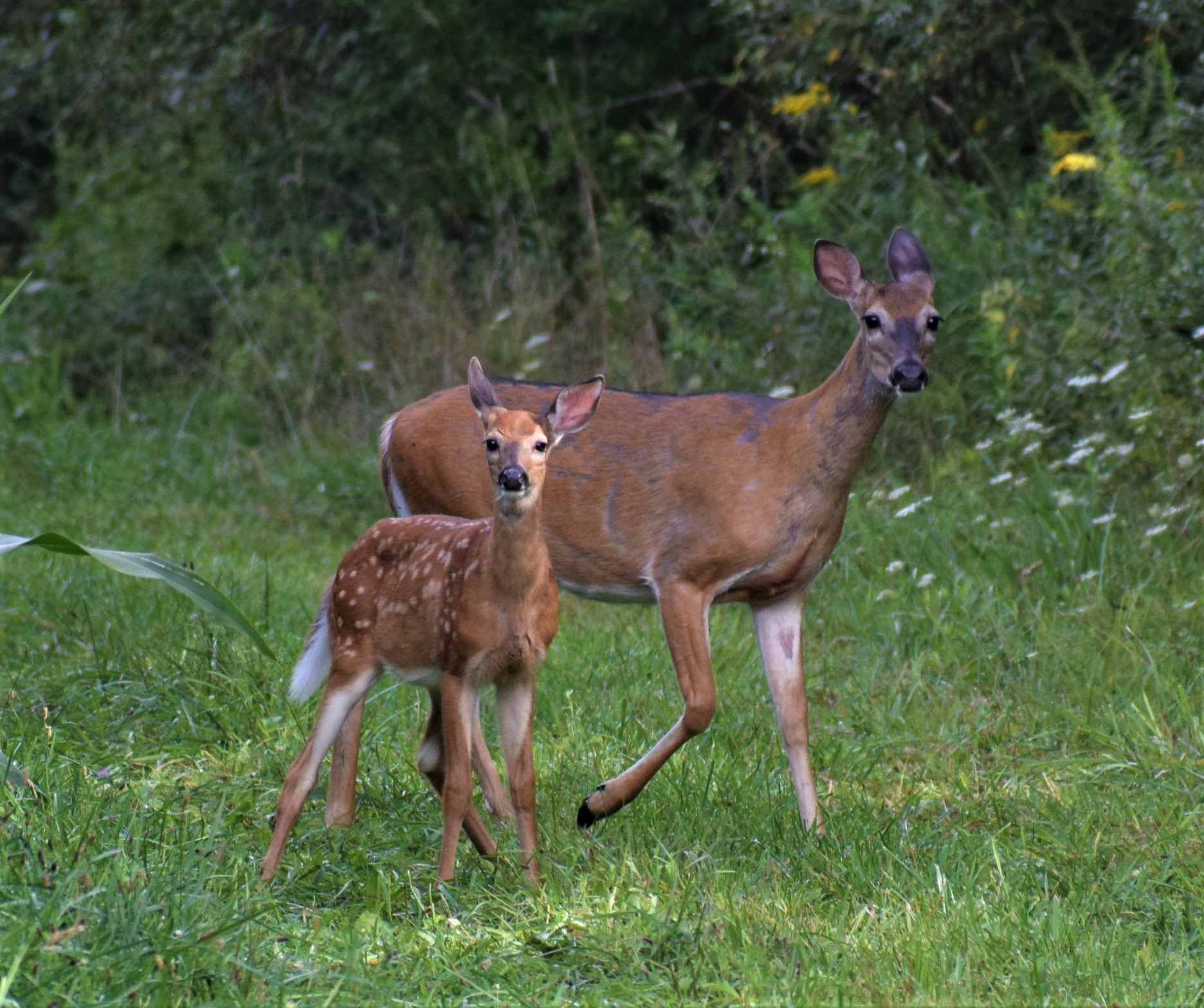 I saw the fawn first, but I saw the corn leaves moving violently to the left. Mama doe emerged followed by a second fawn.