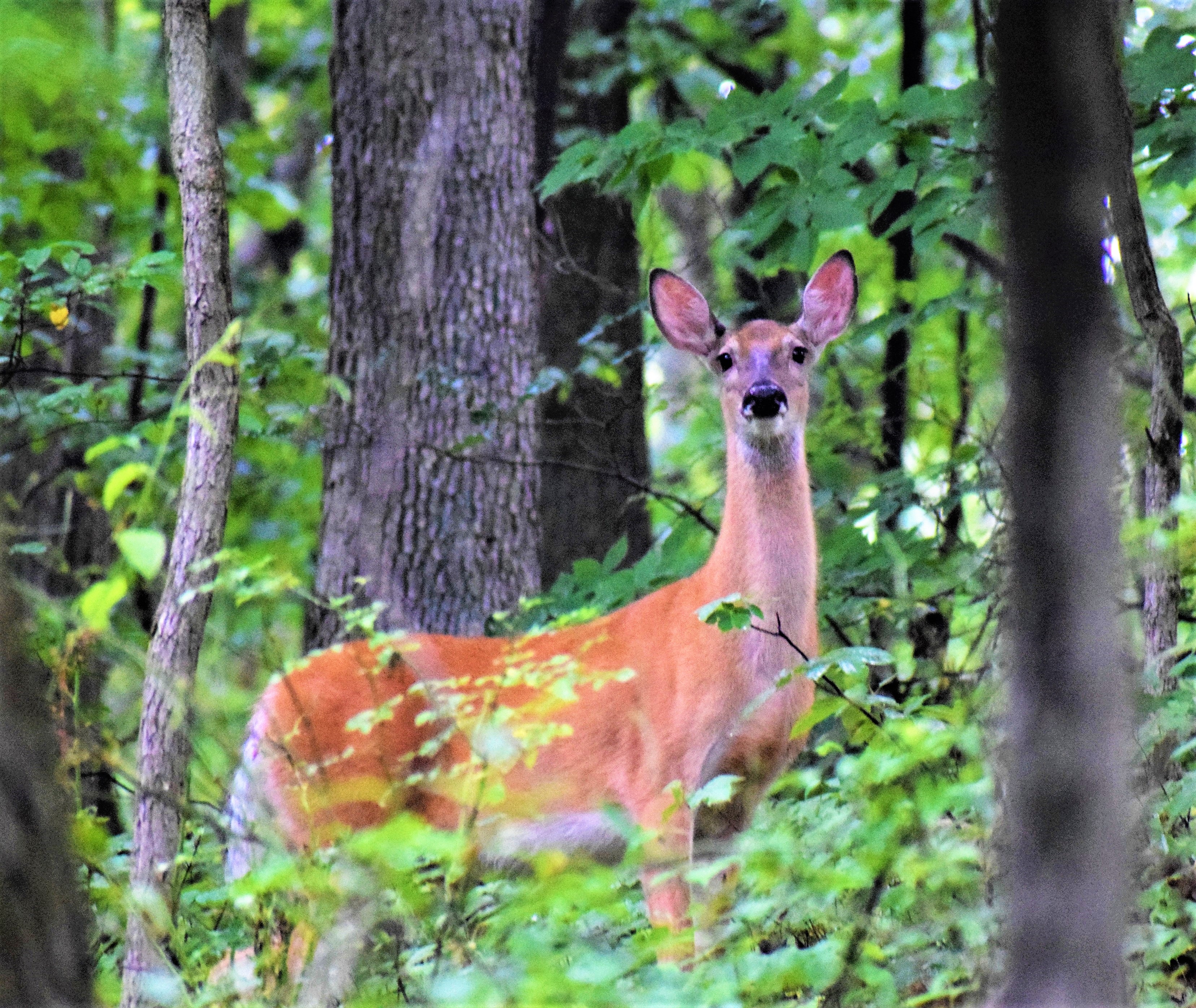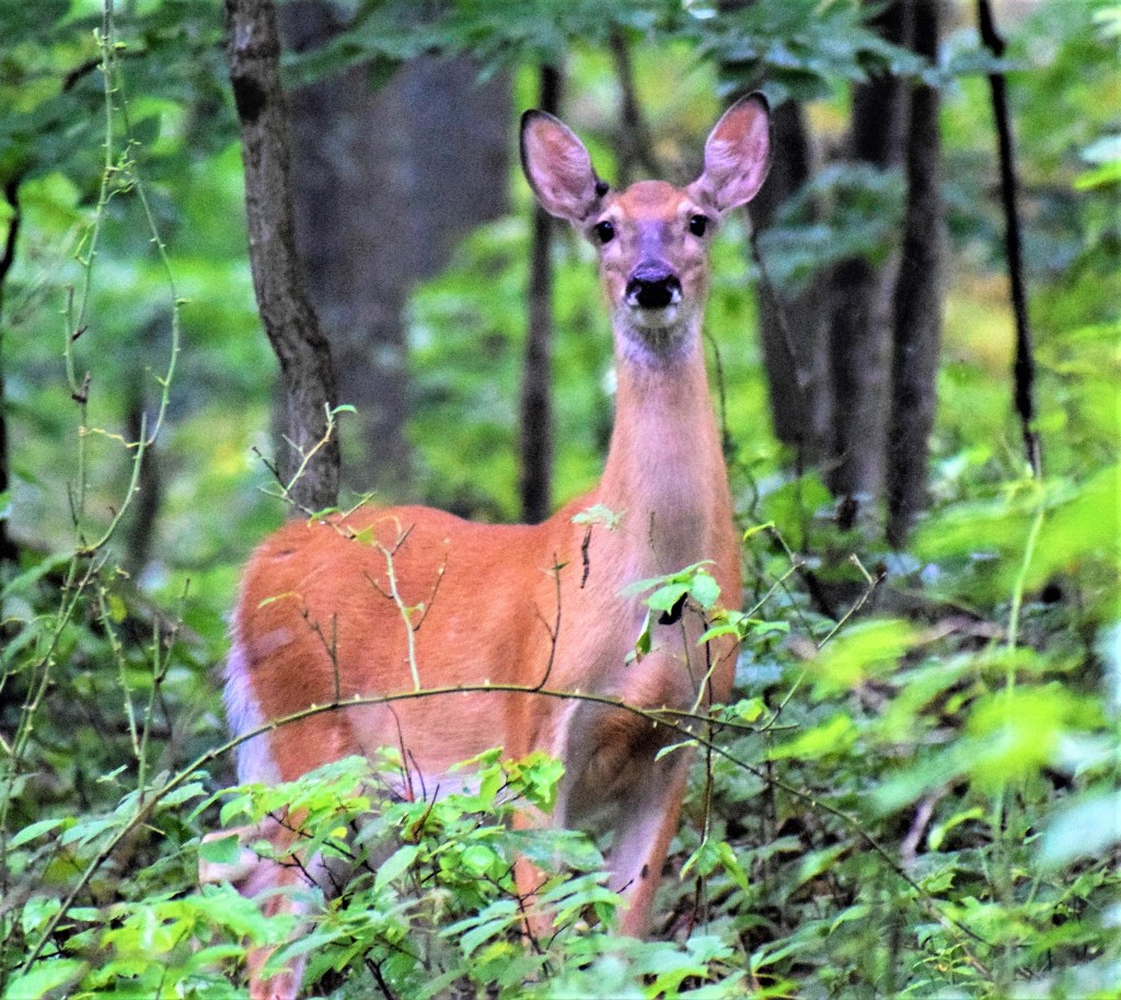 The photos above were of two deer. I was sneaking along and saw the orange-red color among the underbrush. I knew immediately I was seeing two deer. As they fed with their heads down, I would move until I reached about thirty yards or so. I positioned with camera aiming towards an opening. The plan worked flawlessly and the two edged out into the opening allowing for some photos. It wasn’t long before the lead deer became suspicious just prior to a snort and a run.