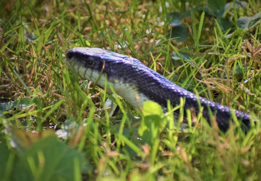 I noticed this Black Snake emerging from my landscaping this afternoon. I ran for the camera. In the couple of minutes, it took to retrieve the camera the snake had ventured out onto the yard. I fell to my belly to snap photos. Most were blurred too much for the snake was moving as I tried to keep up.