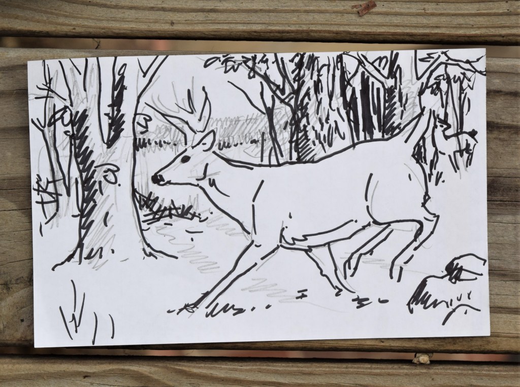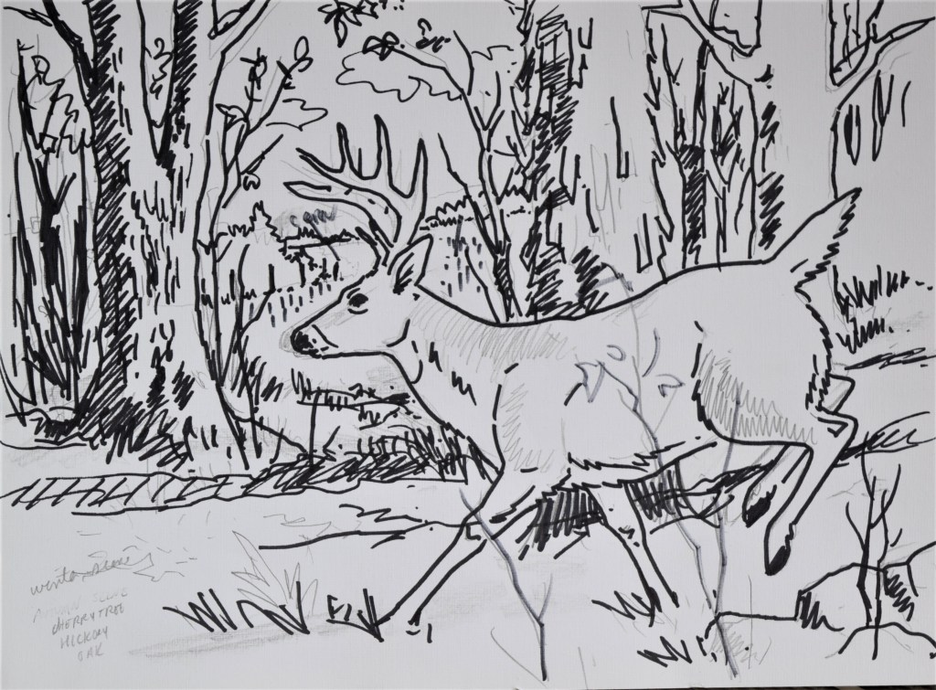 Late last year (2022) I began sketching some ideas down for a Whitetail Deer painting. The plan was to work on a number of thoughts and being finalized by early January. The plan fell in place on the time schedule. Laurie was scheduled to have a food surgery on January 17th. I imagined I would work on the art while being near to help as needed. However, since I quit hunting with the flintlock early, I began the painting process for the above completed painting.