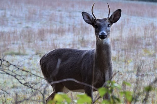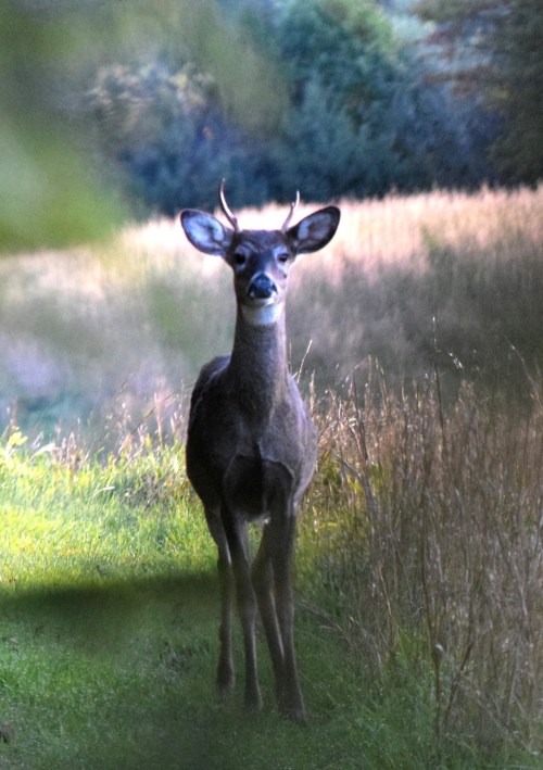 I walked along a field’s edge and spotted a deer nibbling on tree limbs. I assumed it was a male for such actions are common with a buck. I glassed and saw spike antlers. Three more deer appeared in the field feeding. I stalked a distance that I deemed safe to do so. Suddenly, I could see a deer to my left and closing in. I maneuvered among the pines and realized it was the spike. The buck had turned and due to contours found his way right upon me.