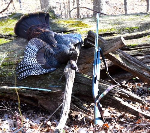 I set up and soon began to hear responses from my calling. About half hour later two young gobblers came to the call and I bagged one at twenty-three steps. I messed around and called another couple of birds in before leaving.
