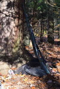 I heard rapid yelping behind me and I readjusted my setting position. I continued calling and I heard a second bird to my left. Soon I could see the darkened body moving among the brush and Mountain Laurel. At twenty-two steps the Remington talked in a loud voice and a young gobbler was down. I uttered some thankful words of prayer.
