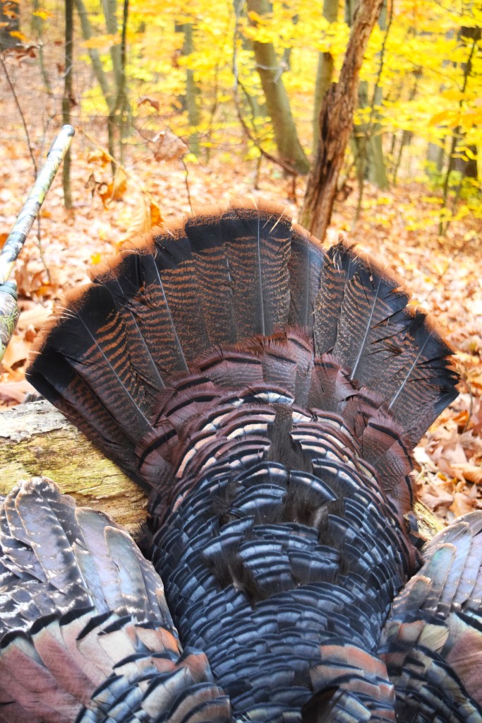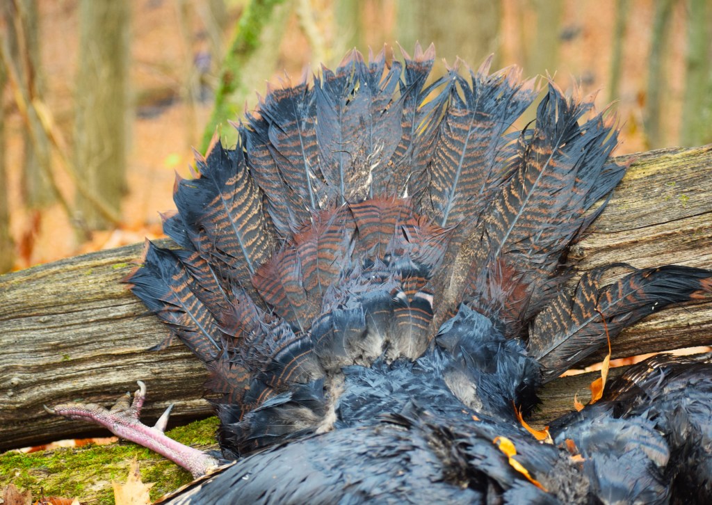 Then my luck went south, so to speak. The gobbler bounced backwards and rolled down the steep hill twenty yards or more. That roll soaked the bird’s feathers in the wet leaves thus not allowing for the perfect photos I would have desired. Oh well… I made it to the house around 8:30!