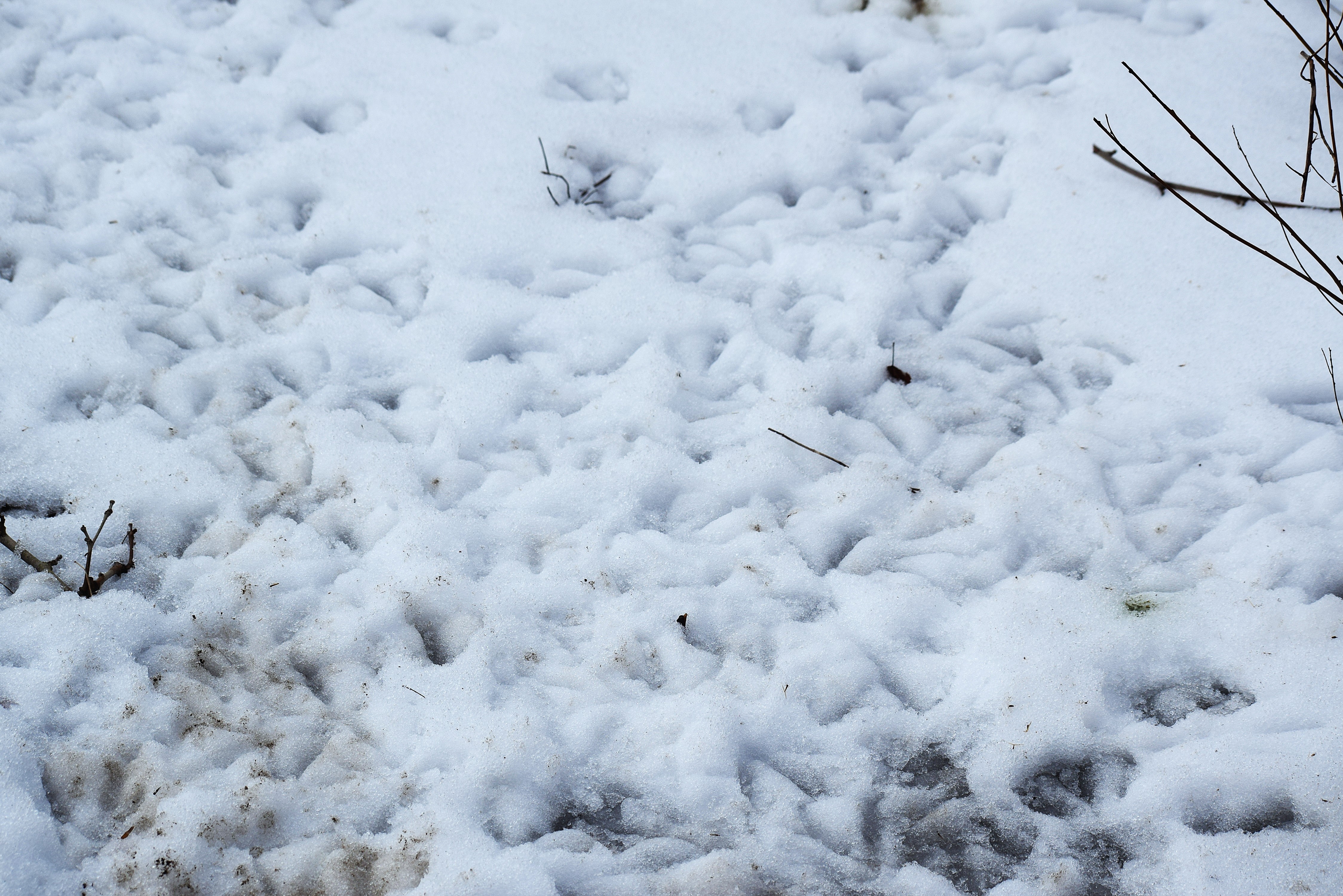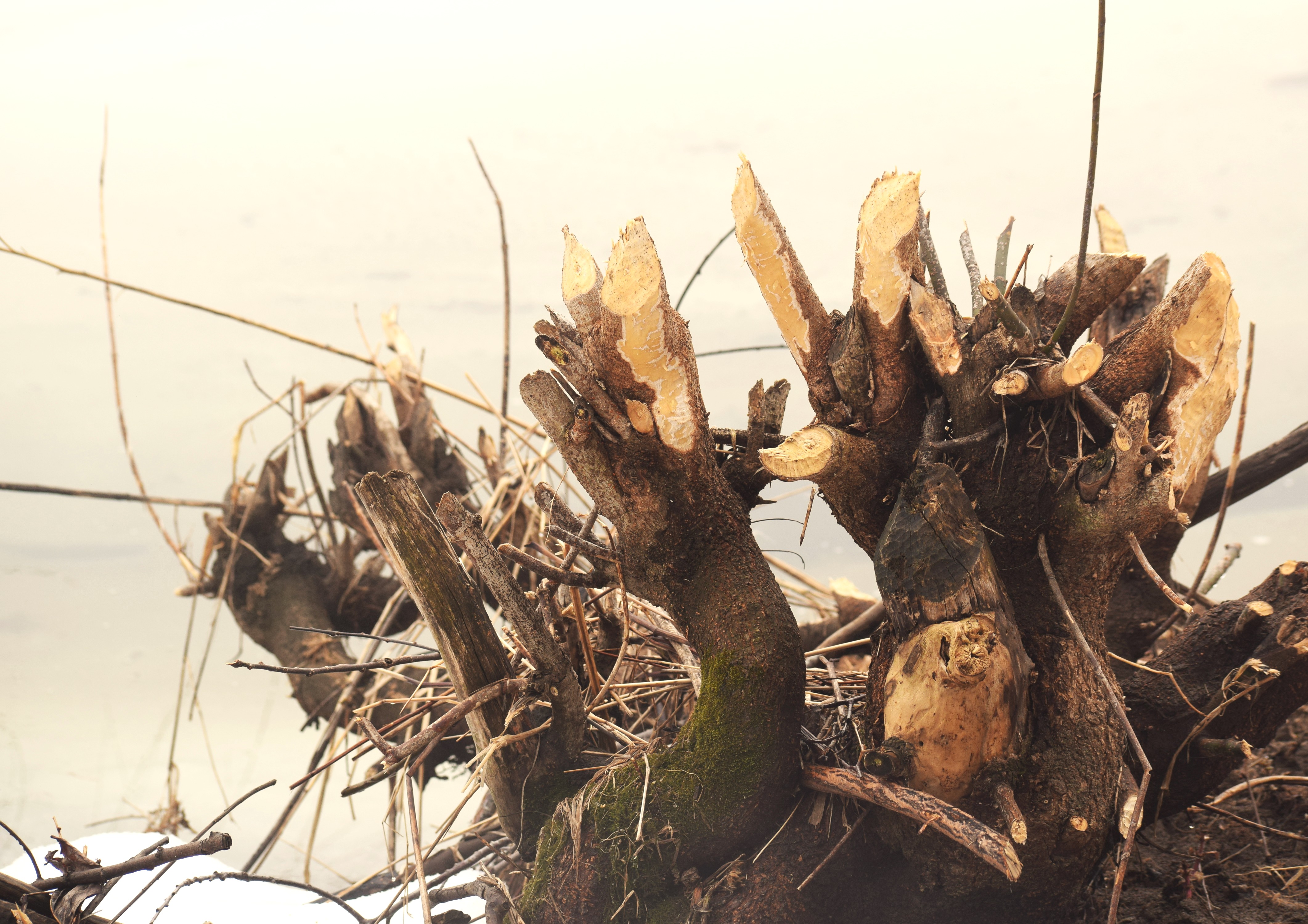 Springtime seems to be coming early if one would include this morning. A heavy fog was over all the area. I went out to enjoy some of this weather. My walk eventually found me along the Allegheny River. The area I was walking had complete ice coverage. The fog was dense that I couldn’t see across the water. However, along the shoreline the weight of the ice had caused a crack allowing for river water to emerge to the shoreline at many places. This allowed for the Beavers to emerge to the bank to eat fresh bark. Old Beaver tracks for common in places.