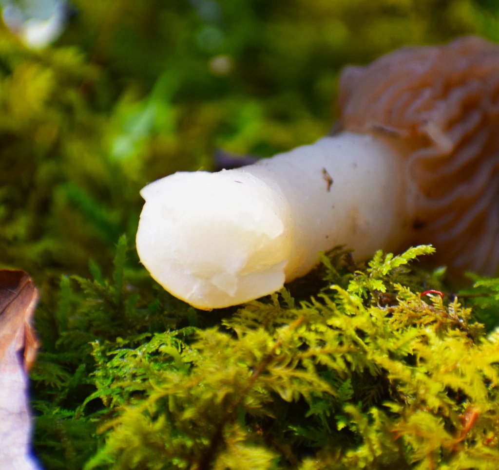 I looked across a log and verbally and excitedly said, “Alright!” What did I see? Morels! I sat down on the ground and took some photos before picking a few. My feelings of joy quickly turned south. The third Morel I picked I notice the stem had that cottony mass inside. These were False Morels. Edible Morels have hollow stems. Morel hunters need to follow this rule. However, one person has said this specie is edible since posting. I am sticking to my rule on the hollow stem only to be safe. No ‘rooms this evening for me.