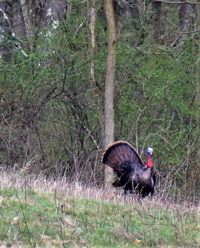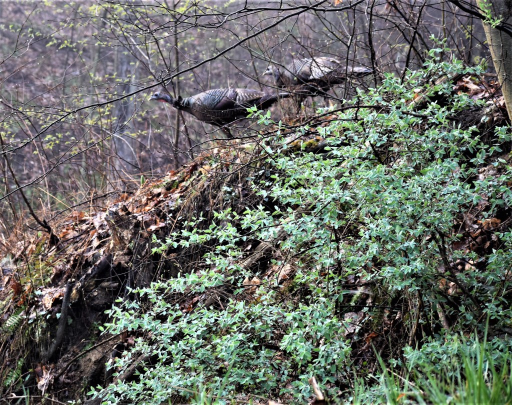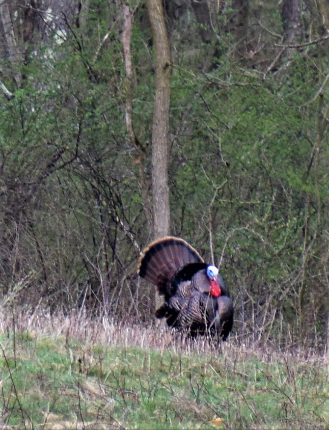 I looked around and didn’t see any poults or eggs, but I am convinced she must have a nest , possibly among the Skunk Cabbage and wetland vegetation across the creek. I will be watching for baby turkeys.