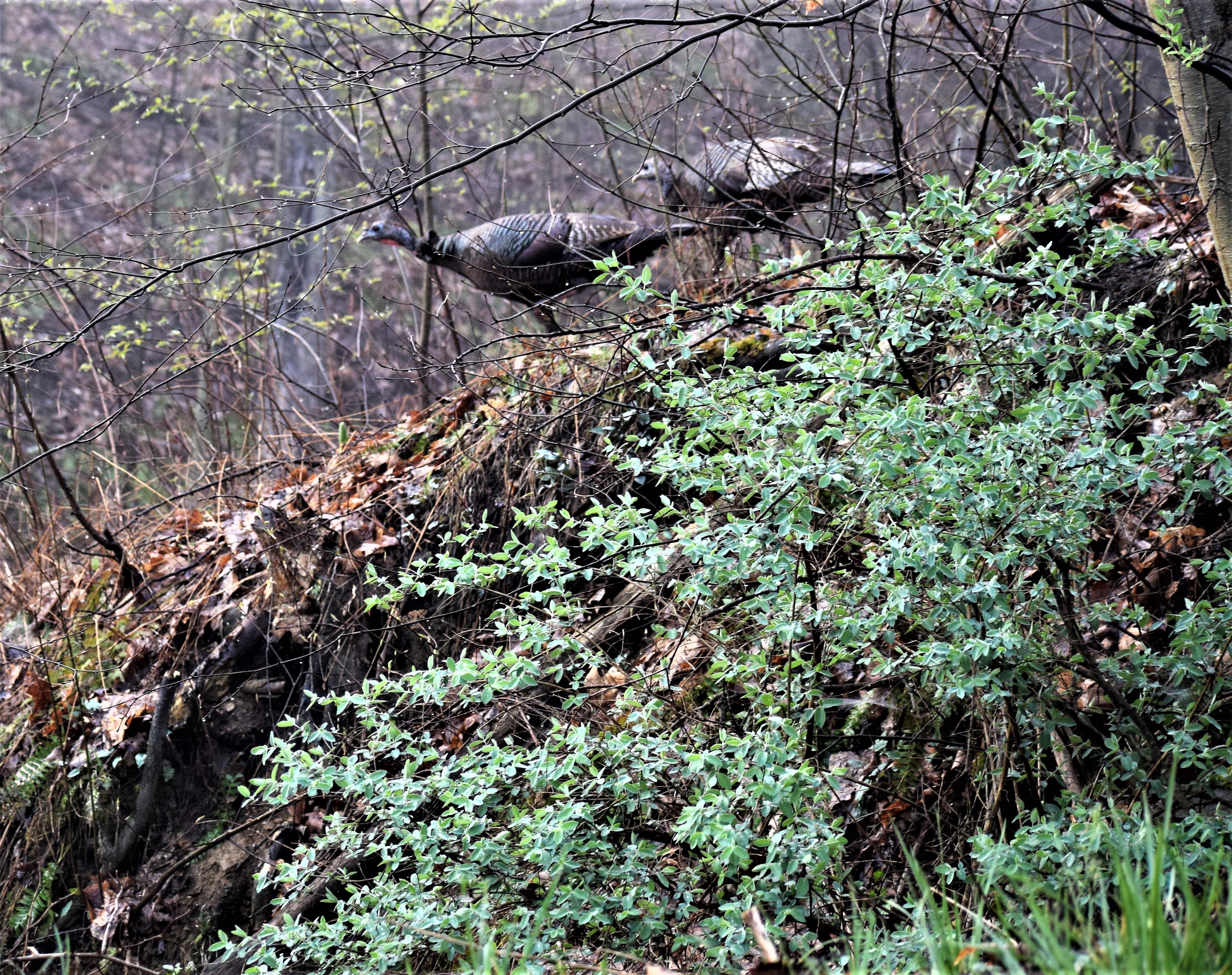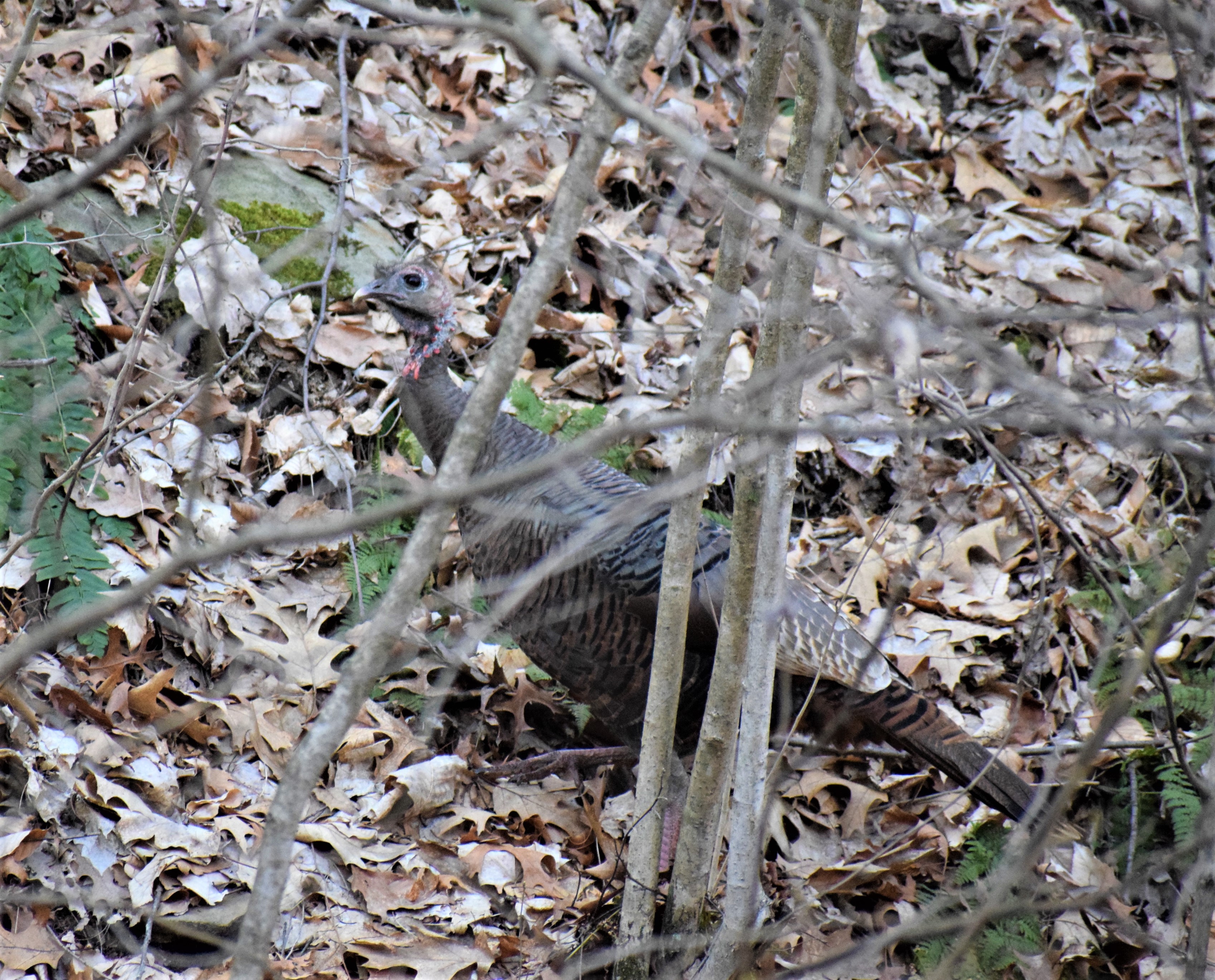 I do not know if she is nesting among my landscaping since it appears as a natural woodland area even having Skunk Cabbage that I planted years ago. I have watched for poults and haven’t seen any.