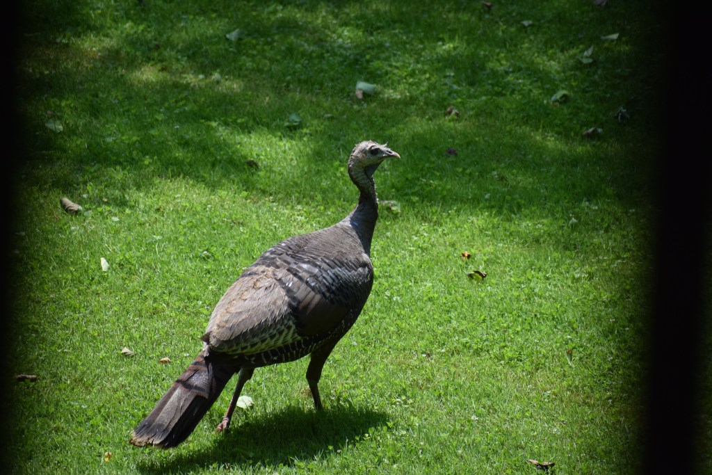 That story goes along well with this story. Recently, I was setting on the back deck when I noticed a hen turkey walking around the back yard. The bird walked about casually sometimes in the grassy areas and other times amongst my natural landscaping. I crept inside and called Laurie to see the turkey. She was visible for around an hour. I thought this viewing sure was interesting. I wondered if she may be nesting here. I did get plenty of photos of her.