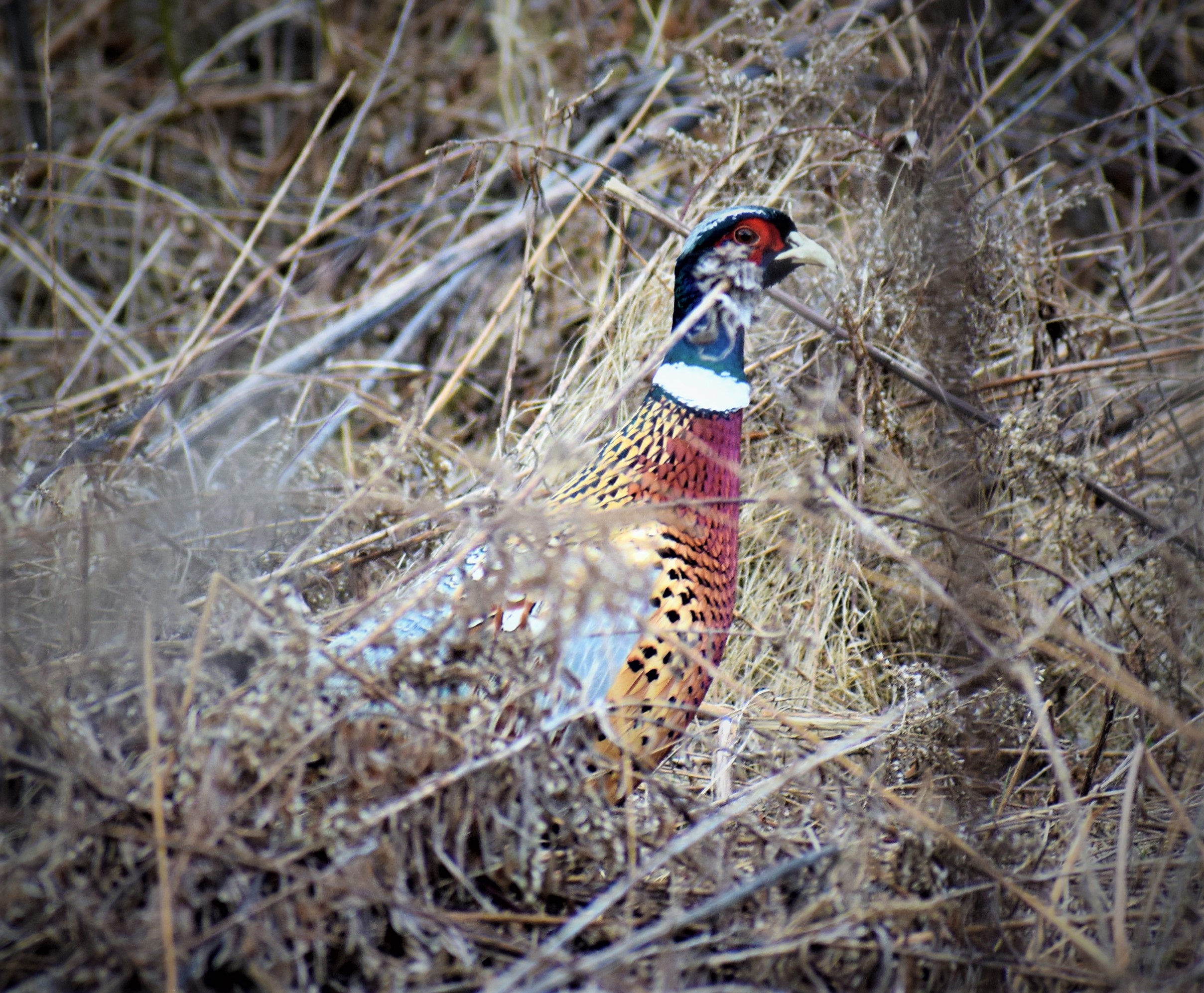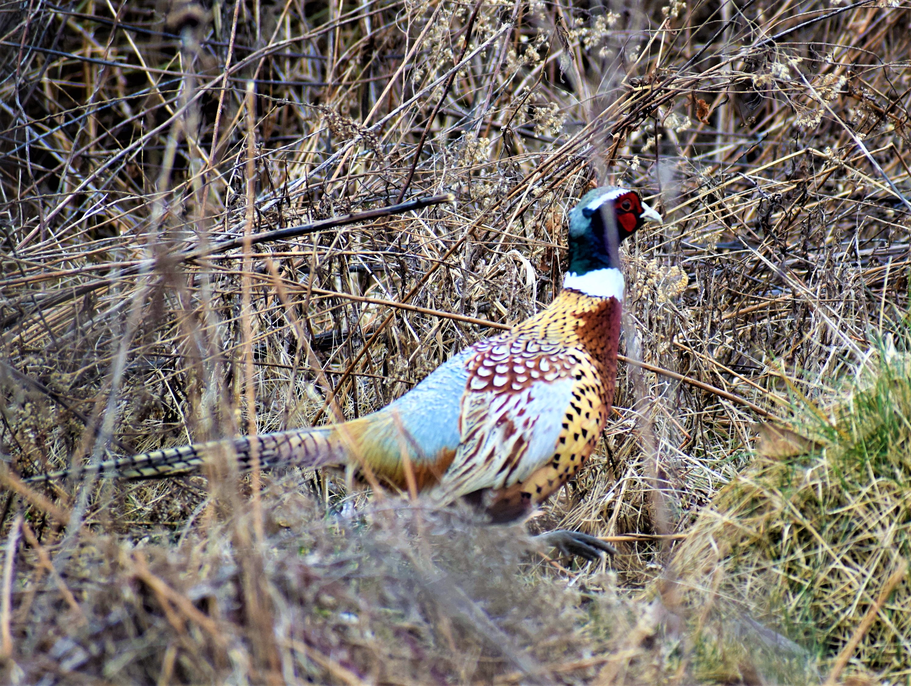 I walked over an hour as I began to circle back towards the jeep. Suddenly I saw some movement in the dried vegetation. One, two, three…four male pheasants were sulking around in the cover hoping I would not disturb them. I maneuvered around to a more open area and behold, here come da birds! I began taking photos whenever more open shots came about.