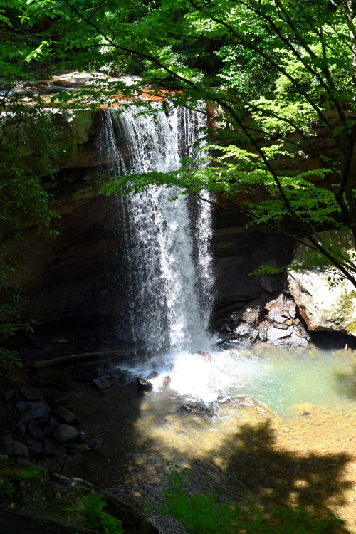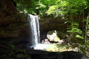 Near Ohiopyle, Pennsylvania is a beautiful waterfall named Cucumber Falls. The falls is located on Cucumber Run which flows onward to the Youghiogheny River. The falls is about thirty feet high.